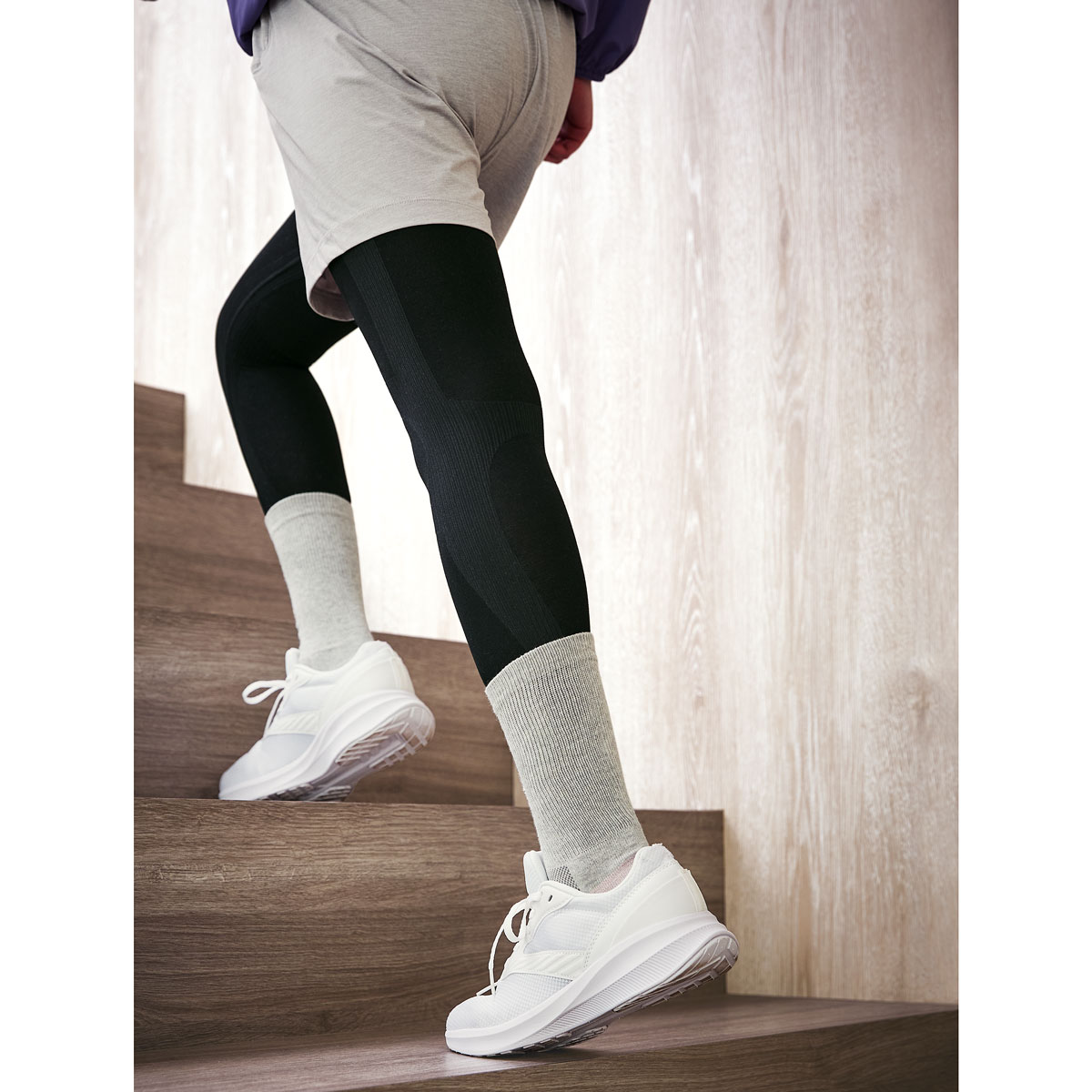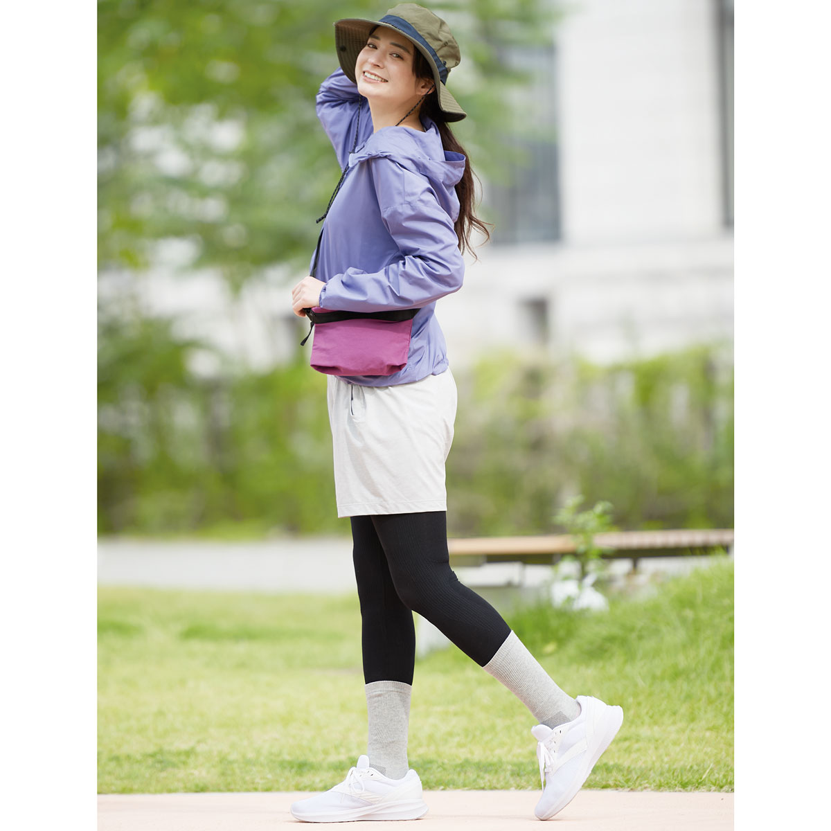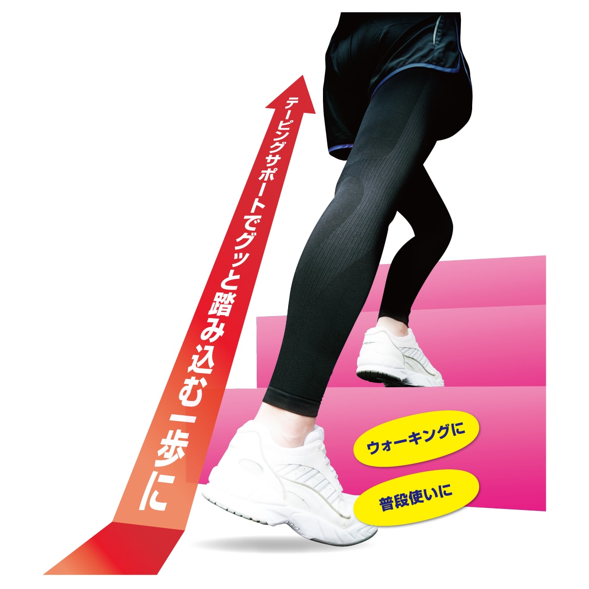 スパッツの各部分に編み方を変えたテーピング機能を施し、下半身の動きをしっかりサポート。テーピング機能により筋肉の動きを支えながら歩けるので、普段動かしくい部分をサポートしてくれます。薄手でアウターにひびきにくく年中着用していただけます。