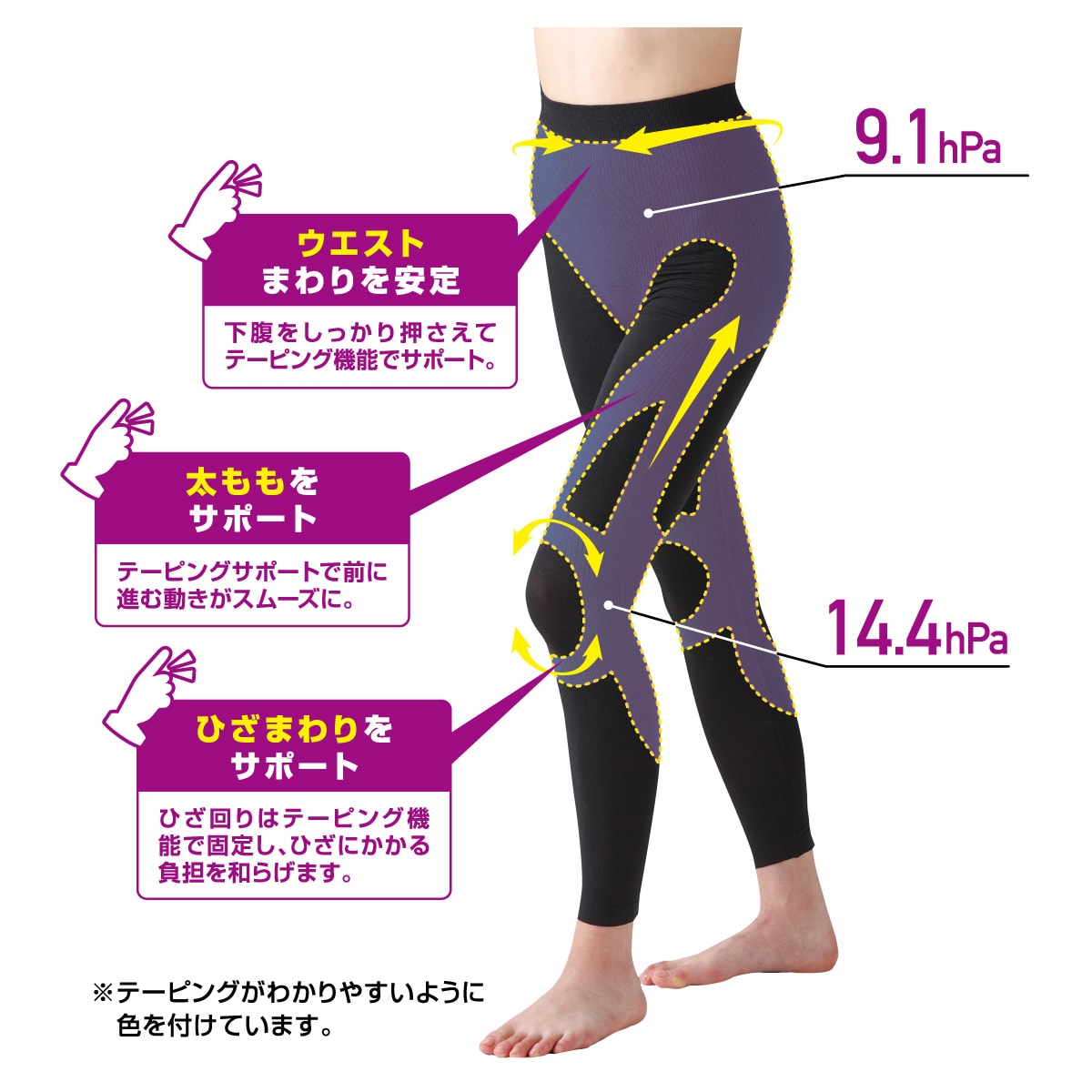 テーピング機能をこの一枚で! (1)9.1hPa(2)ウエストまわりを安定 下腹をしっかり押さえてテーピング機能でサポート。(3)太ももをサポート テーピングサポートで前に進む動きがスムーズに。(4)ひざまわりをサポート ひざ回りはテーピング機能で固定し、ひざにかかる負担を和らげます。(5)14.4hPa ※テーピングがわかりやすいように色を付けています。