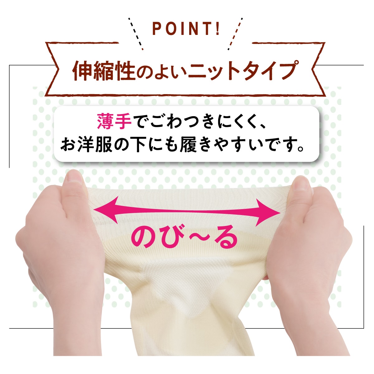 伸縮性に優れた薄手のニットタイプ。ごわつきにくいのでお洋服の下にも履きやすい。ひざ頭とひざ裏は通気性のいいメッシュ素材で汗をかいても快適です♪