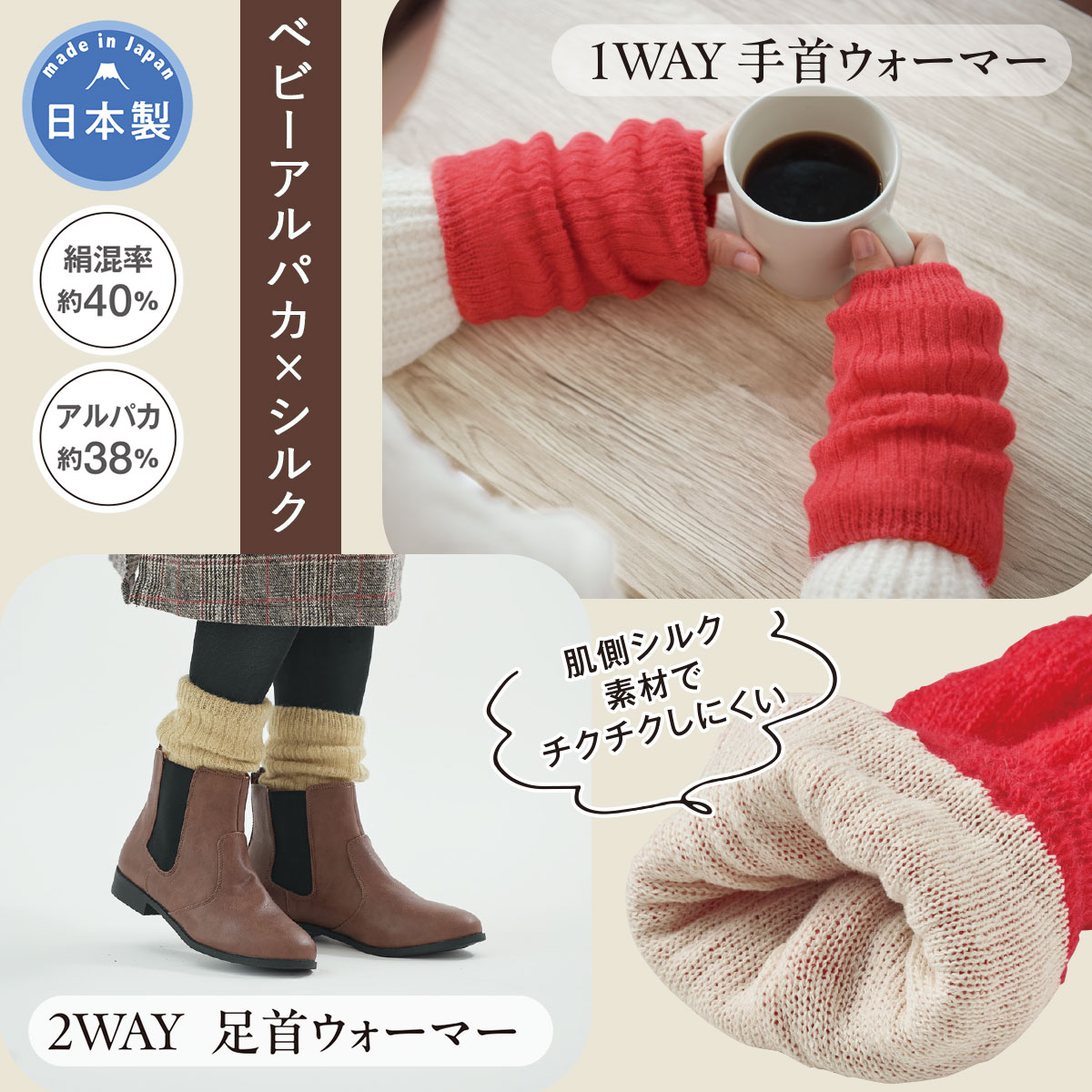 細くやわらかな繊維を厳選した、希少なベビーアルパカを使用。とても軽く、履いた瞬間から包み込まれるようなあたたかさを実感。手首ウォーマーとしてだけでなく、足首ウォーマーとしても2WAYでお使いいただけます。肌側はシルク素材でチクチクしにくい点もポイントです。日本の工場で熟練工が丁寧につくりました。