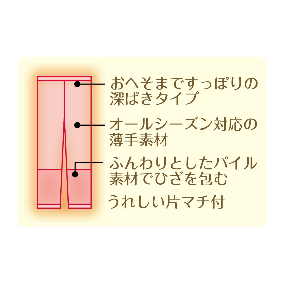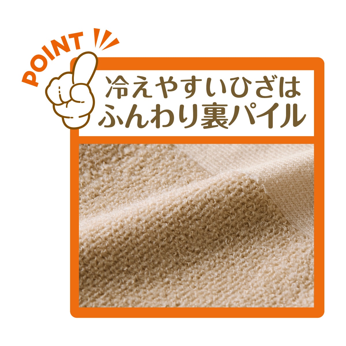 ひざ部分をパイル(タオル地のようにふわっと)仕様にすることでふんわりあたたかいサポーター機能を付けました。パンツ部分は薄手で伸縮性が良く動きやすく締めつけ感も少なく快適です。後ろマチ付きでヒップをしっかり包み込み動きやすくなっています。インナーパンツとサポーターを重ねて着用しなくていいのでアウターにひびきにくく着ぶくれが気にならないので、スラックス下として年中活躍します。おへそまですっぽり隠れる深履きタイプで安心。