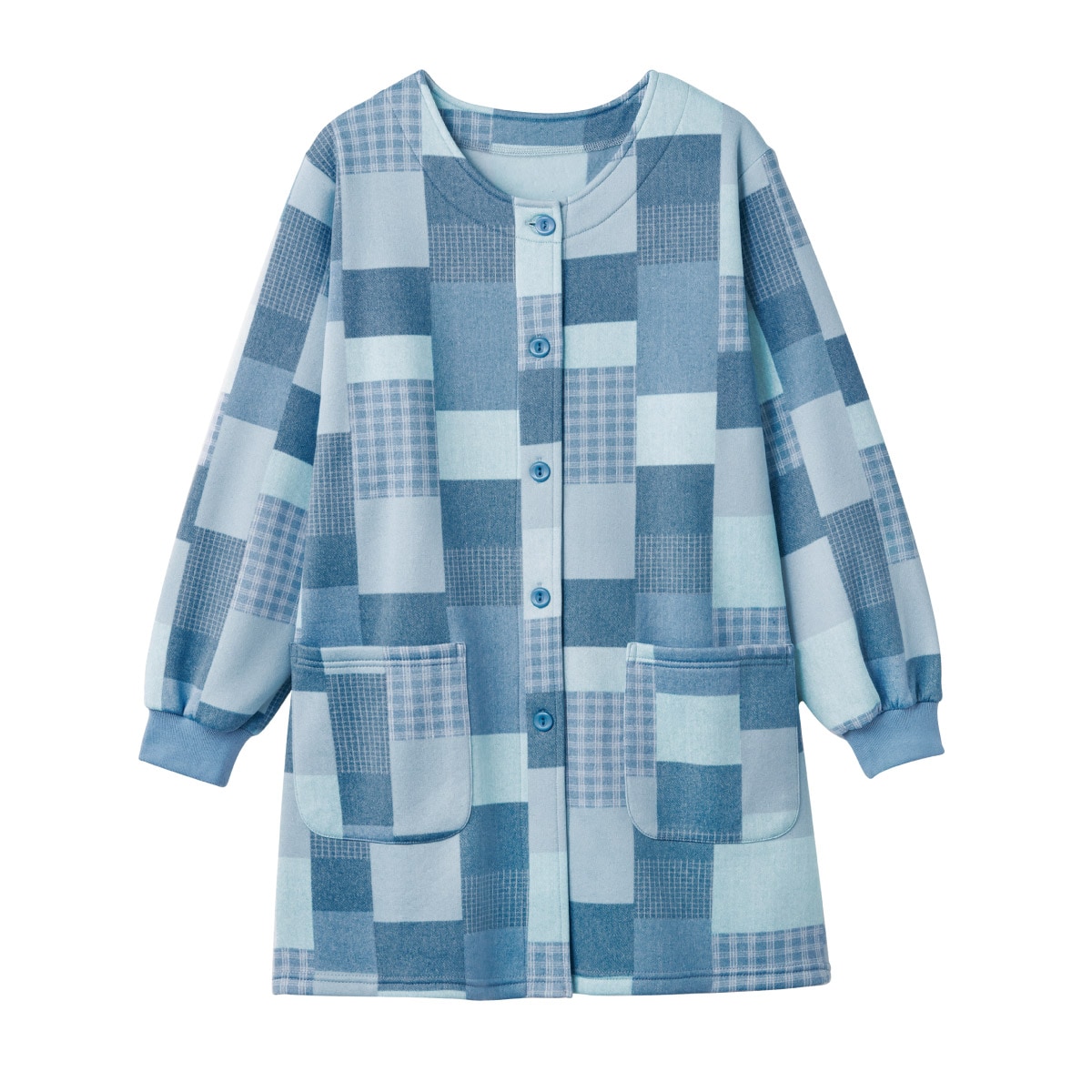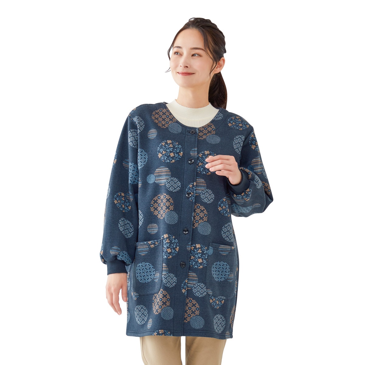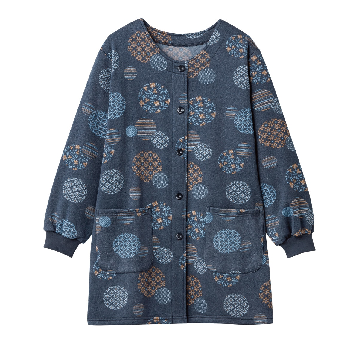 軽くて暖かい裏起毛生地でお尻もすっぽり隠れるロング丈の前開きかっぽう着。ちょっとしたお買い物にもおすすめ!