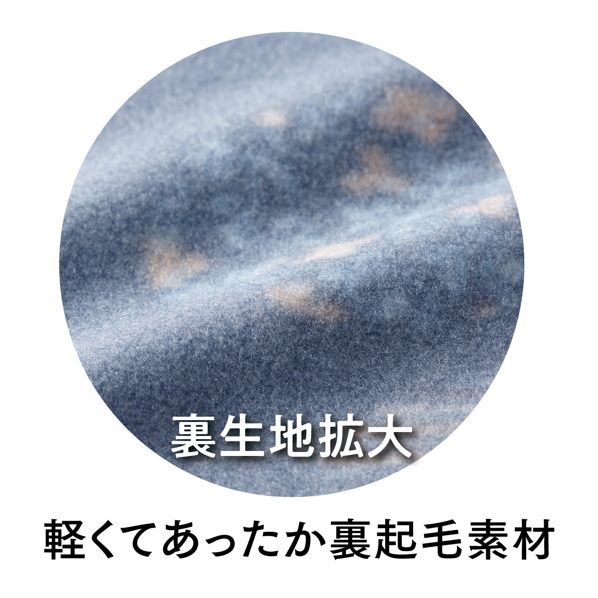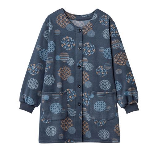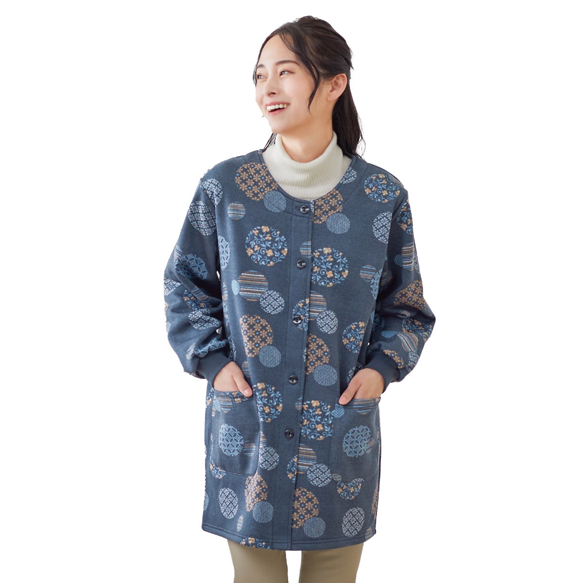 軽くて暖かい裏起毛生地でお尻もすっぽり隠れるロング丈の前開きかっぽう着。ちょっとしたお買い物にもおすすめ!