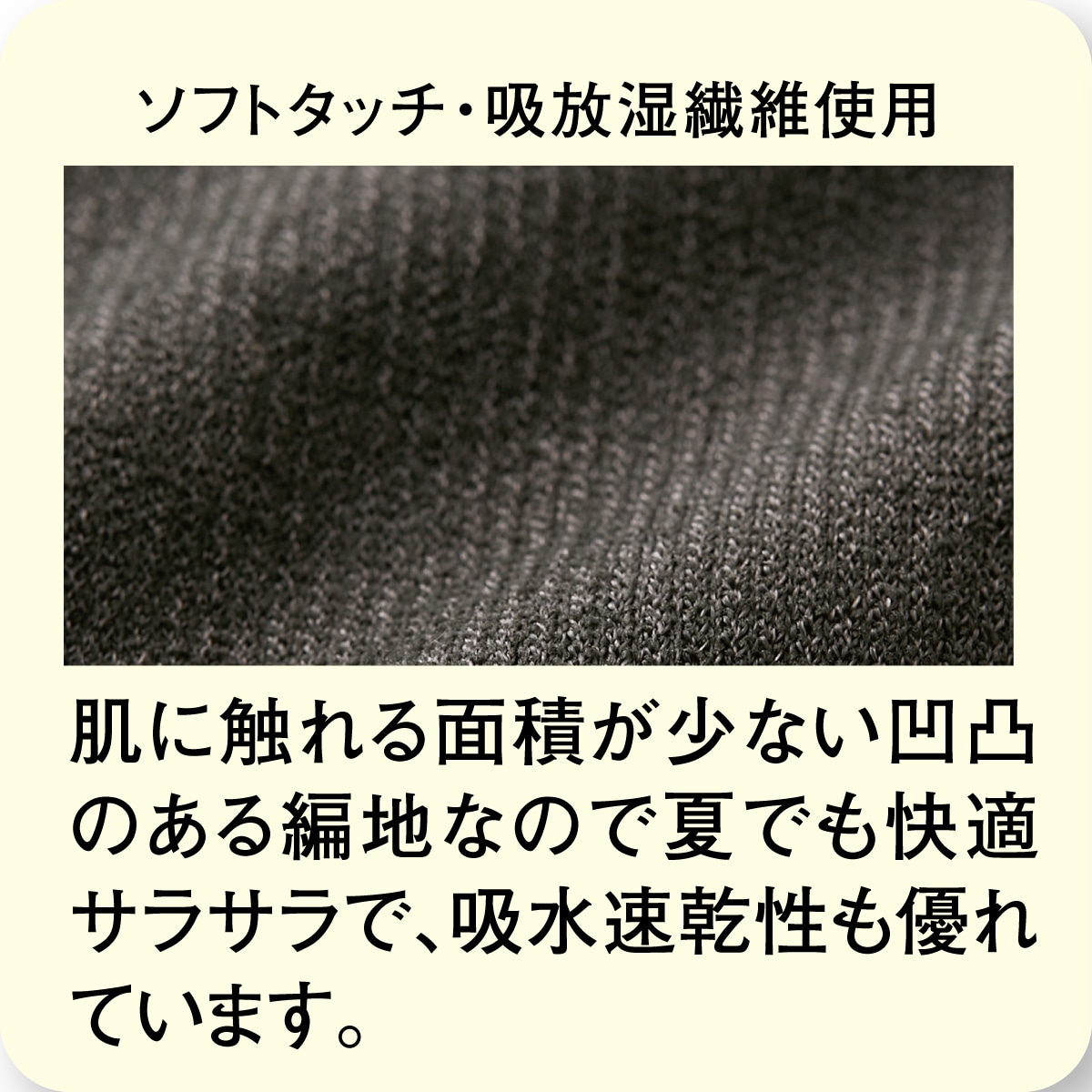 ムレやすいヒップやウエスト部分は通気性の良いメッシュ編み、ヒップより下部は肌に触れる面積が少ない凹凸のある編地で、夏でも快適な吸汗・速乾仕様のサラサラレギンス。紫外線遮へい約91%で、見落としがちな足元のUV対策ができます。お出かけやスポーツ時に、おうちでのくつろぎタイムにも着用いただけます。