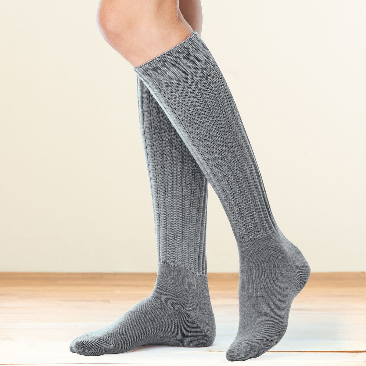 ふっくらやわらかでボリュームたっぷりの肉厚素材を使った、年間定番のロングヒットソックス。足底肌側のみパイル編みで肉厚感があり、ふだんの靴もきつくなりにくい仕様にこだわりました。足首から上は締めつけ感の少ないゆったり仕様。伸び伸びのはき口でゴム跡が残りません。ご要望にお応えして、かかと・つま先の配色タイプをつくりました。ふくらはぎ全体を冷やしたくない方には、同シリーズのハイソックスタイプ(SL-762)もおすすめです。