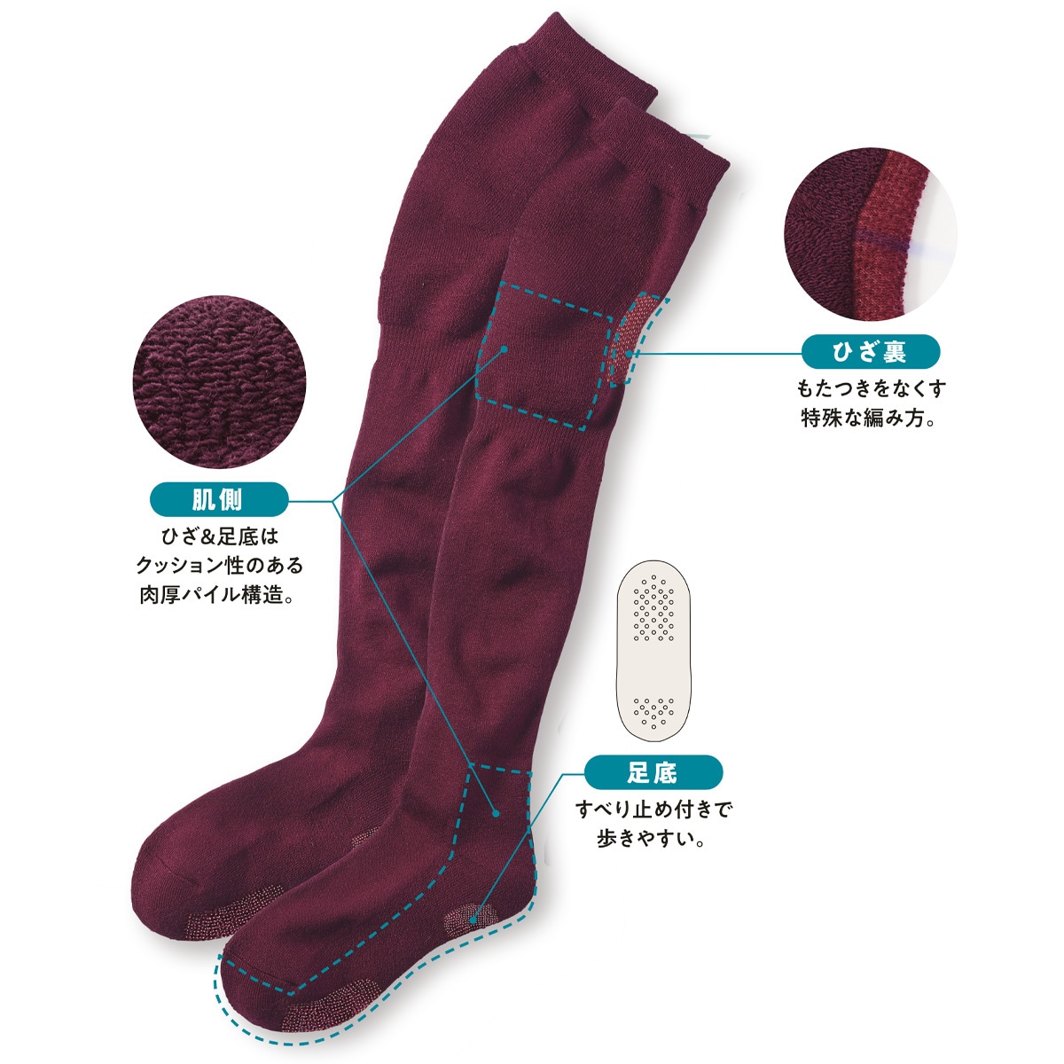 冷えを感じやすい膝までしっかり温めたい方におすすめの、ひざ上まですっぽり包むオーバーニー。ボリュームのある肉厚素材を使い、特に冷やしたくないひざと足底の内側は肉厚パイルで、ふっくらあったか。ひざ裏は特殊な編み方でもたつきをなくしました。さらにつま先とかかとには滑り止め付きで、歩きやすさにも配慮しています。