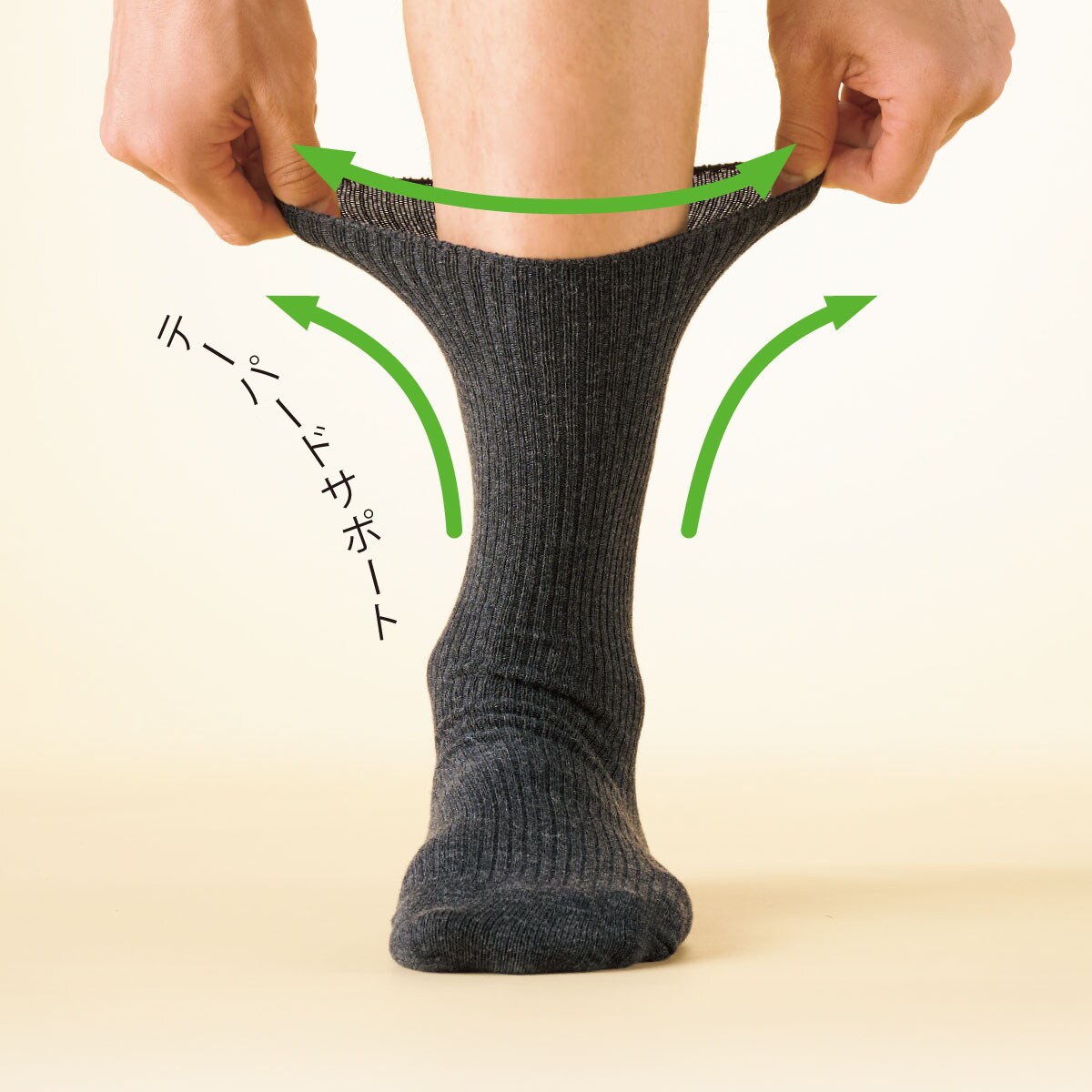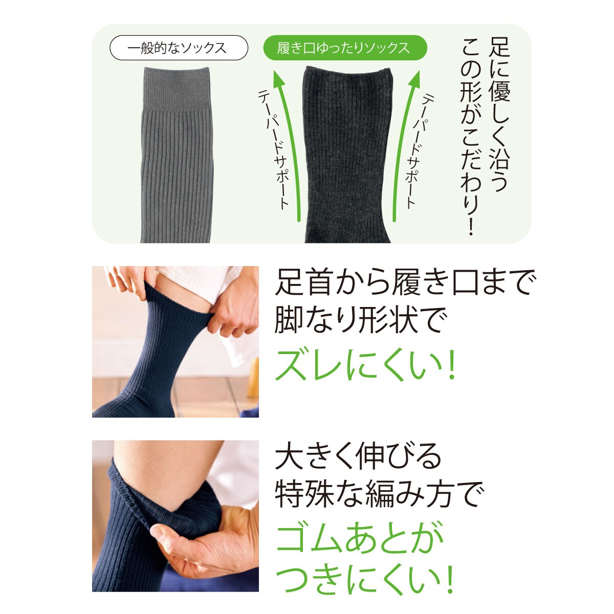履き口ゆったりソックス テーパードサポート 足首から履き口まで圧力を広く分散させ、やさしくフィットします。テーパードサポート 一般的なソックス