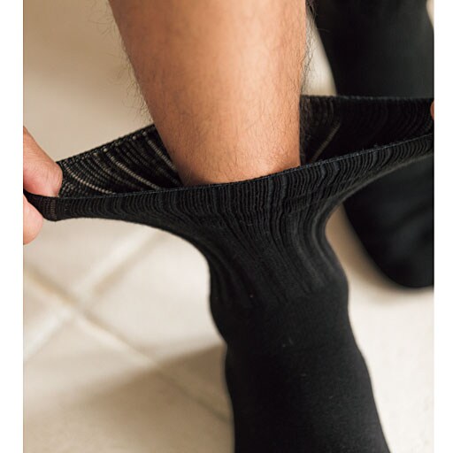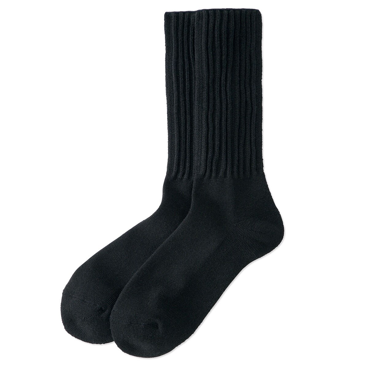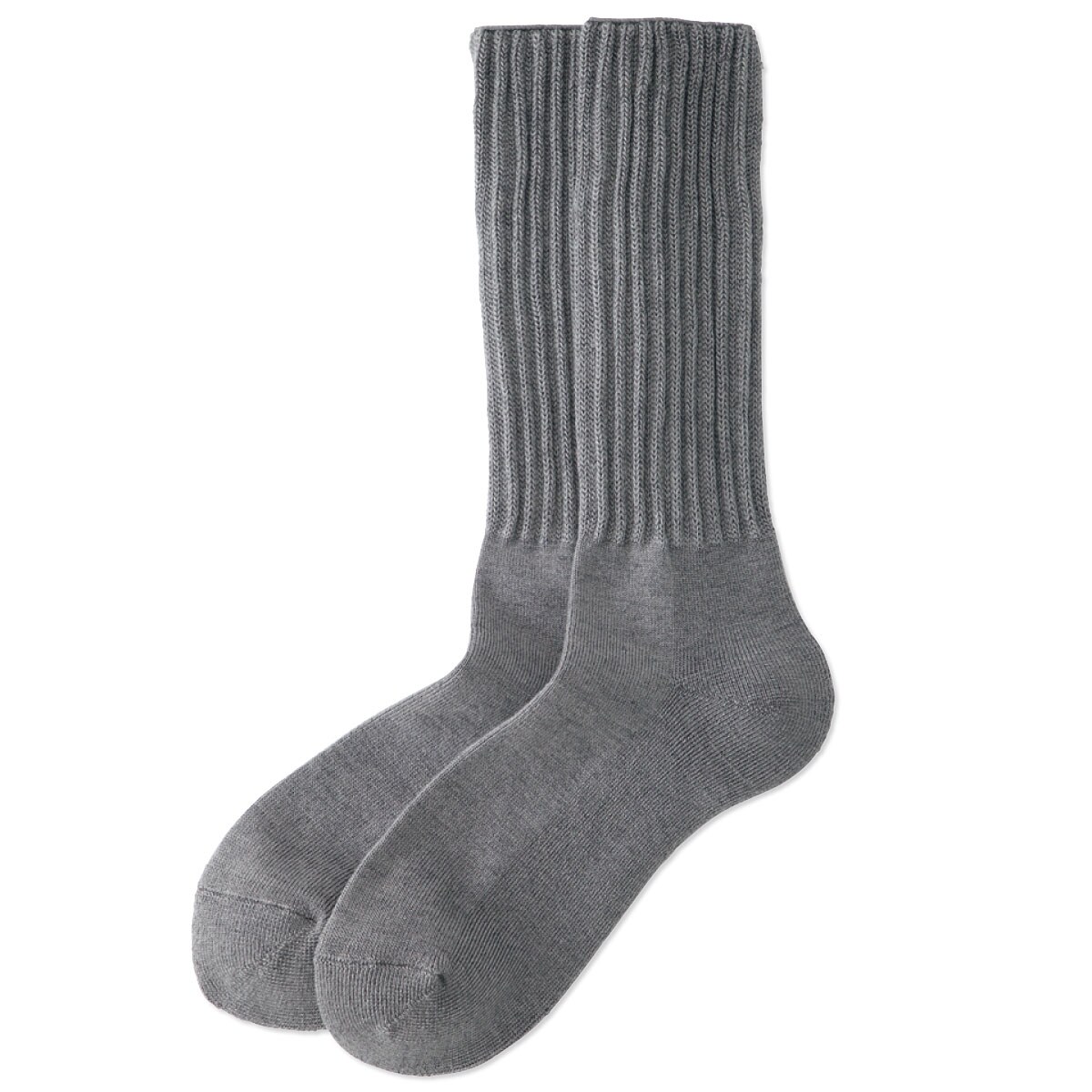 -お買い得ポイント-ゴムの圧力を分散させることで、締め付けを感じにくい快適な履き心地を実現しました。-デザイン-オーソドックスな丈のクルーソックスも、履き口ゆったり仕様。特殊な編み方を採用しているので、履き口が大きく伸び、脱ぎ履きも楽ちんです。-素材特徴-足底のパイル地が、柔らかな履き心地とあたたかさも提供。