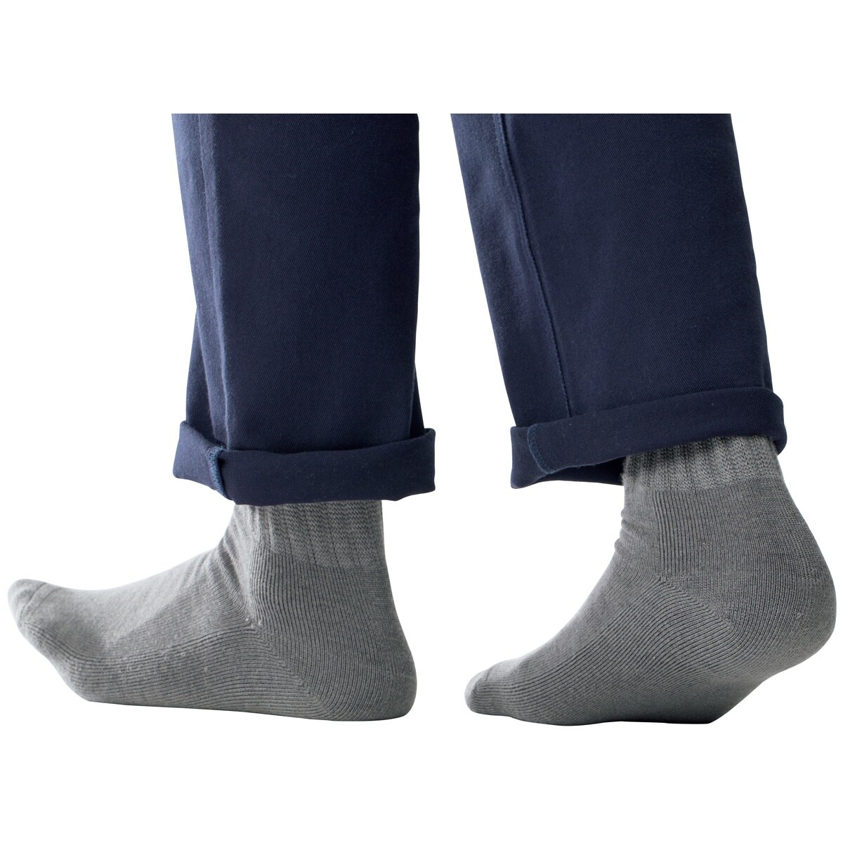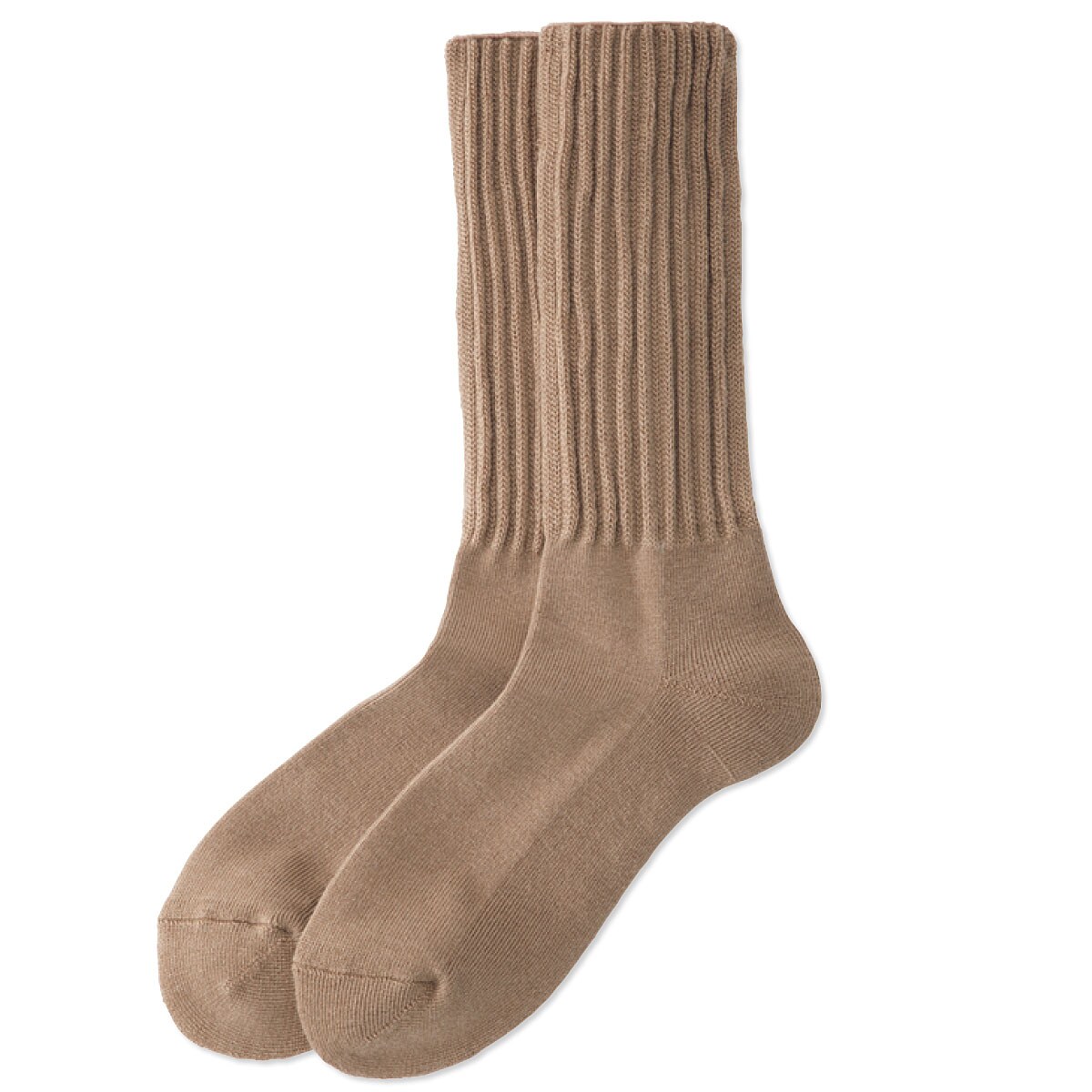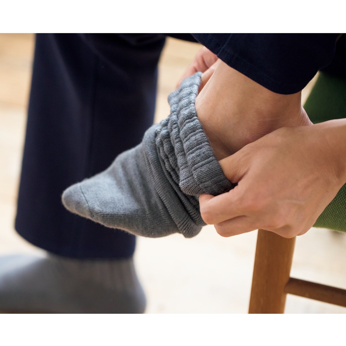 -お買い得ポイント-ゴムの圧力を分散させることで、締め付けを感じにくい快適な履き心地を実現しました。-デザイン-オーソドックスな丈のクルーソックスも、履き口ゆったり仕様。特殊な編み方を採用しているので、履き口が大きく伸び、脱ぎ履きも楽ちんです。-素材特徴-足底のパイル地が、柔らかな履き心地とあたたかさも提供。