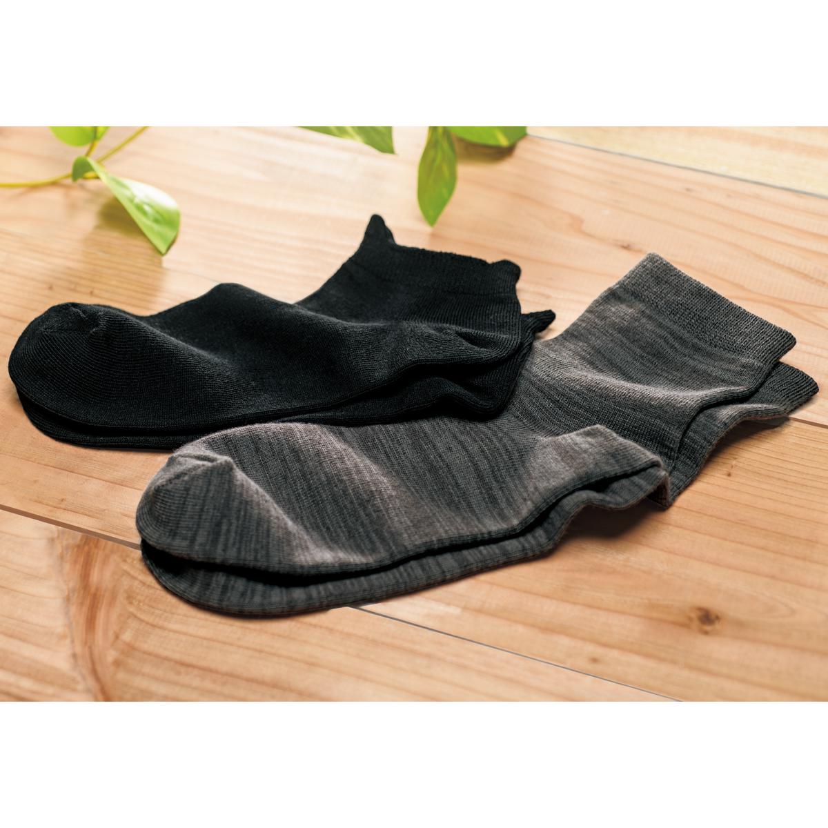 機能素材吸汗・速乾、抗菌防臭機能で汗ムレや臭いを軽減し、洗濯後の乾きも速く、足元はいつもサラサラカラーブラック・グレーモクの2色展開