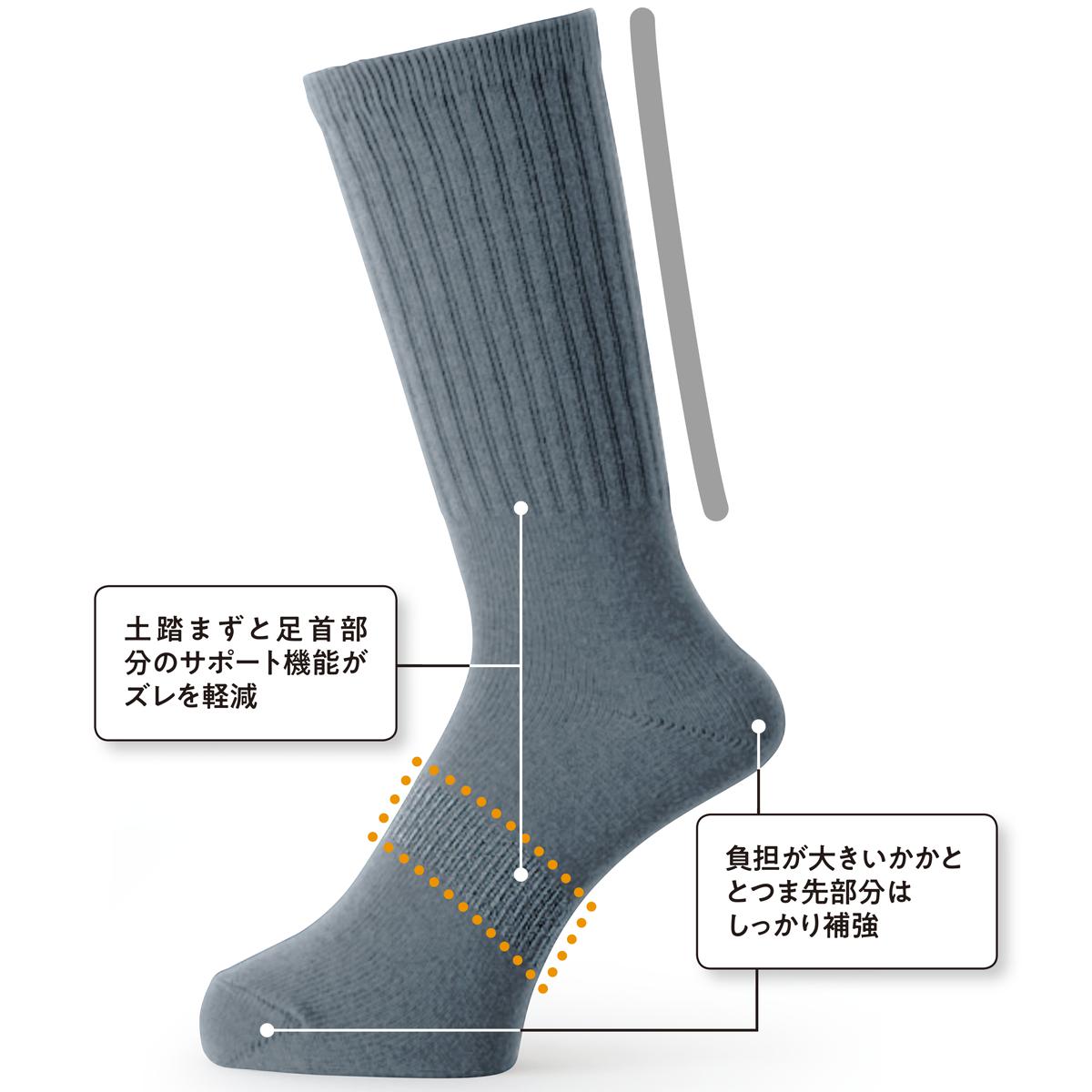 -お買い得ポイント-踏ん張りを支える収まりの良いかかと設計ソックスです。-デザイン-土踏まずと足首部分のサポート機能がズレを軽減。負担が大きいかかととつま先部分はしっかり補強。-素材特徴-ぴったりフィットしてズレの少ないストレッチ素材です。