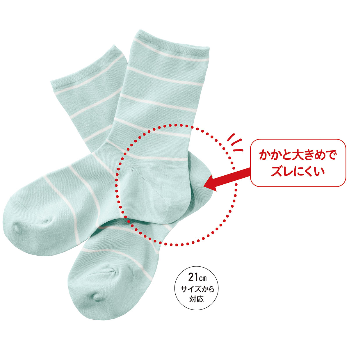 足の形に近い大きめかかと仕上げだから、足にきちんとフィットしてズレにくい。