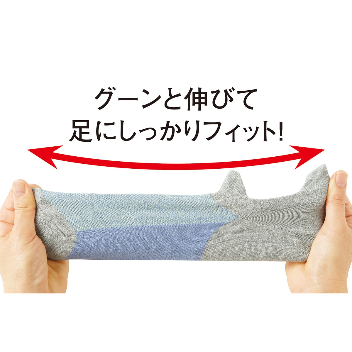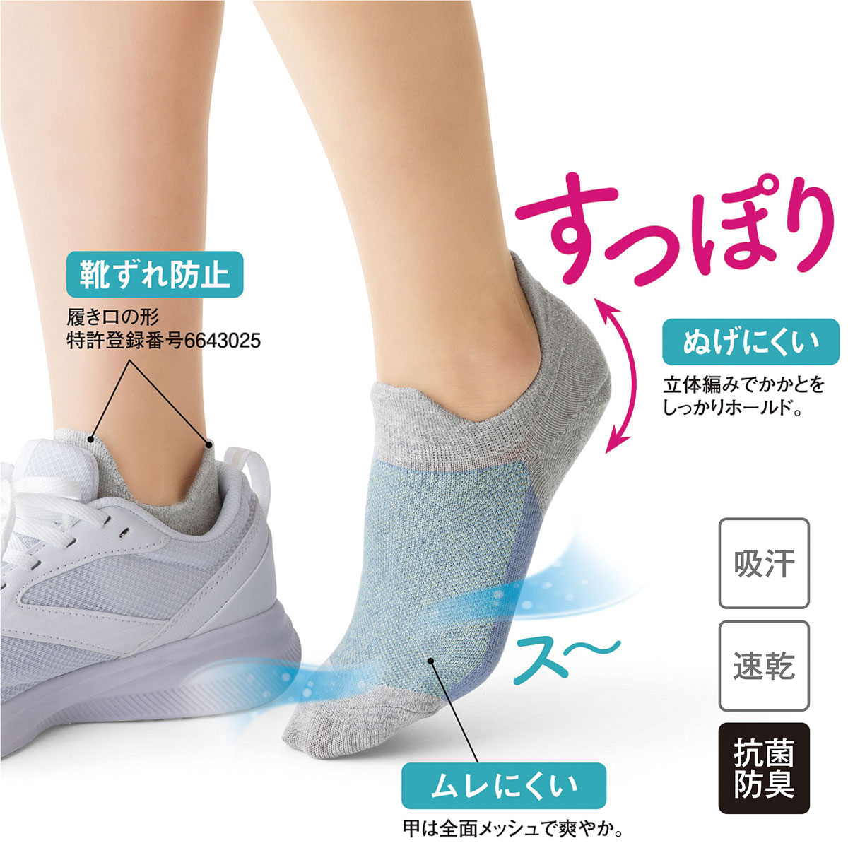 スニーカーをはくときの快適さを考えて設計したスニーカー丈のソックス。はき口は、スニーカーが足に直接当たらないよう工夫したデザイン。かかとをしっかり包み込む設計で脱げにくく、甲の部分はメッシュ仕様で通気性をアップ。ぐーんとよく伸びるストレッチ素材で足にフィットし、吸汗・速乾・抗菌防臭機能で気になるニオイ&ムレを軽減。