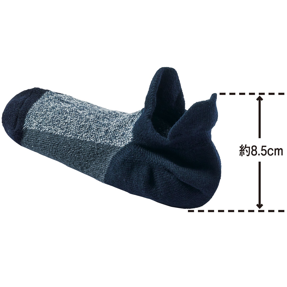 スニーカーをはくときの快適さを考えて設計したスニーカー丈のソックス。はき口は、スニーカーが足に直接当たらないよう工夫したデザイン。