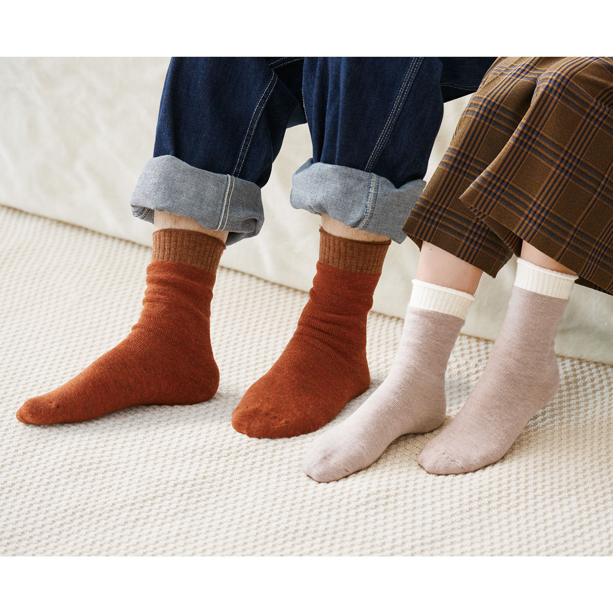 あたたかいのにムレにくく汗冷えしにくいファインメリノウール靴下。男女兼用です (左から)レンガ、ベージュ着用例