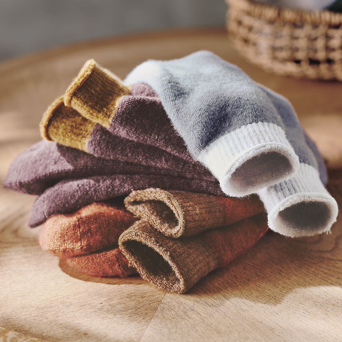繊維のすき間に空気の熱をためこんで暖かく、汗などの湿気は素早く吸い取ってムレにくく。ファインメリノウールはウールの中でも特に繊維が細くチクチクしにくい優しい肌あたりが特徴。そんなファインメリノウールを全体の90%以上も贅沢に使用。肌側は肌なじみのよい細かなループの総パイル仕様でごわつきにくく、はき心地快適。さらに防縮加工・洗い加工で柔らかさを残したままギュッと目が詰まった厚みのある生地に仕上げました。暖かさを求めて丁寧に作った自信作です。