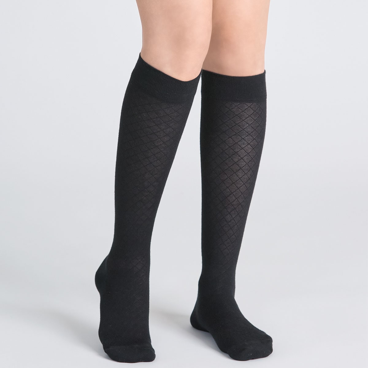 日中のお疲れ脚はお任せ!お出かけ「アシスキット®」。定番の無地とダイヤ柄から選べます。可愛くはいて、キュキュッと引き締める、賢いお出かけ着圧ハイソックスです。はき口はソフト仕様でくい込みにくくしました。ふくらはぎゆったりサイズもご用意しています。■アシスキットシリーズの、着圧ソフトタイプハイソックス丈もあります(SP-187)