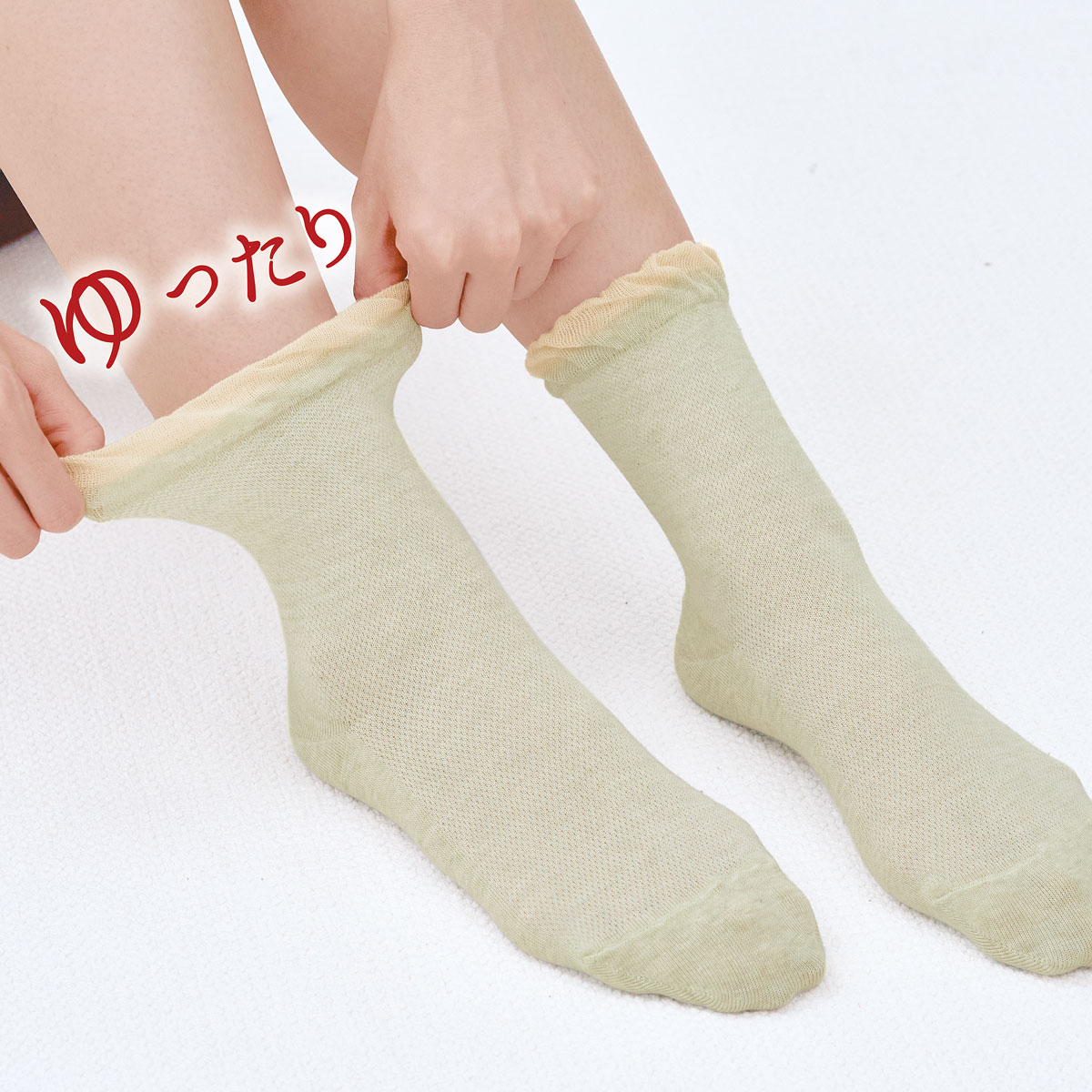 履き口ソフトで、ゆったり締め付けにくい。ボタニカル綿ソックス。E(グリーン) 着用例