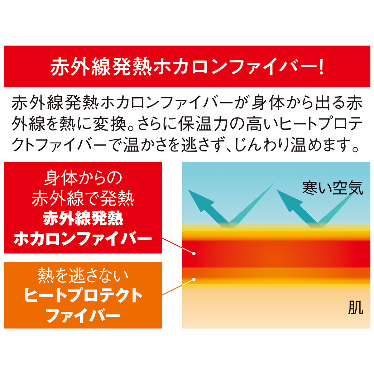 赤外線発熱ホカロンファイバーが身体から出る赤外線を熱に変換。さらに保温力の高いヒートプロテクトファイバーで温かさを逃さず、じんわり温めます。