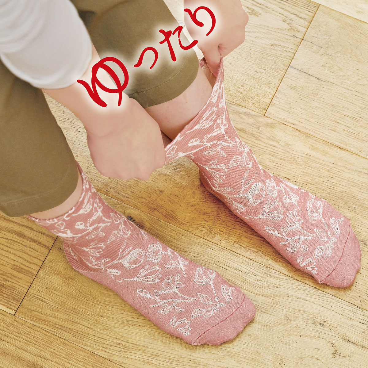 肌に触れる部分はほぼ綿素材。履き口はゴム無しで、ゆったり締め付けない日本製の靴下。
