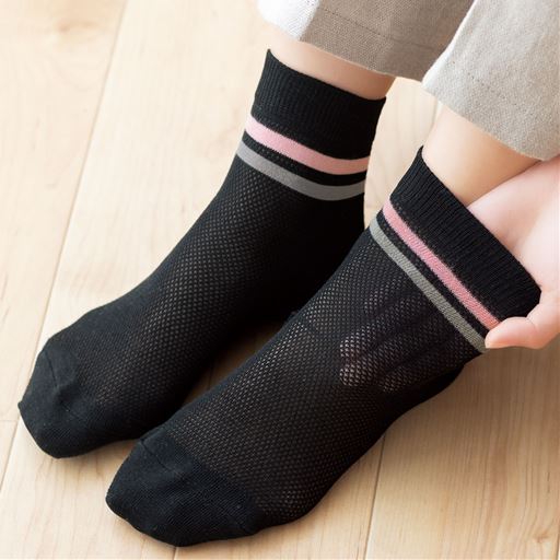 素足より快適な、足裏までメッシュ編みのラインソックス。 ブラック系着用例