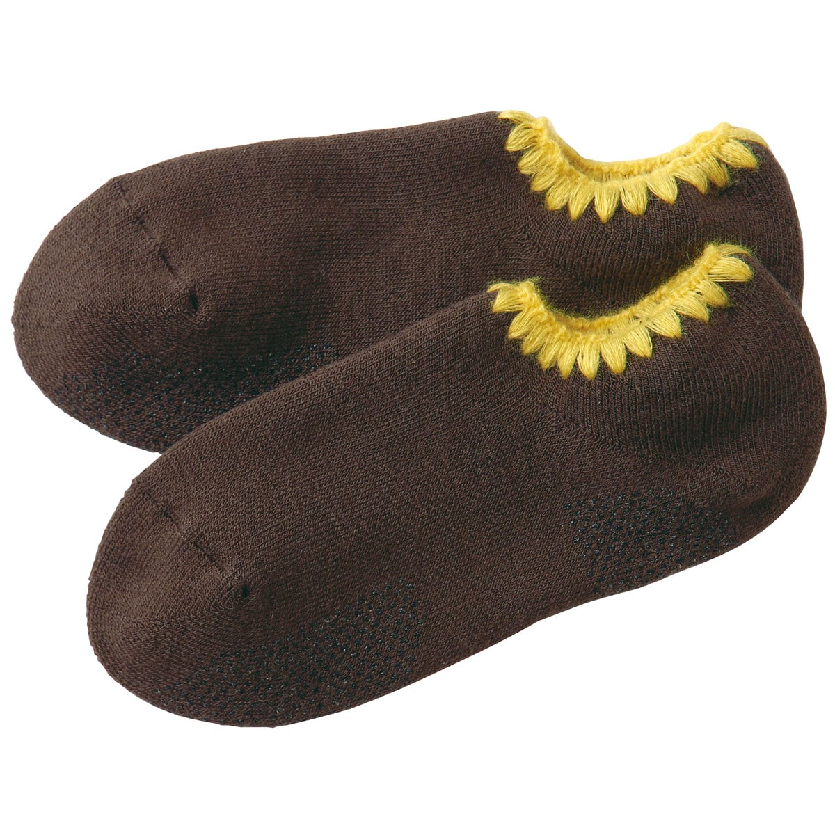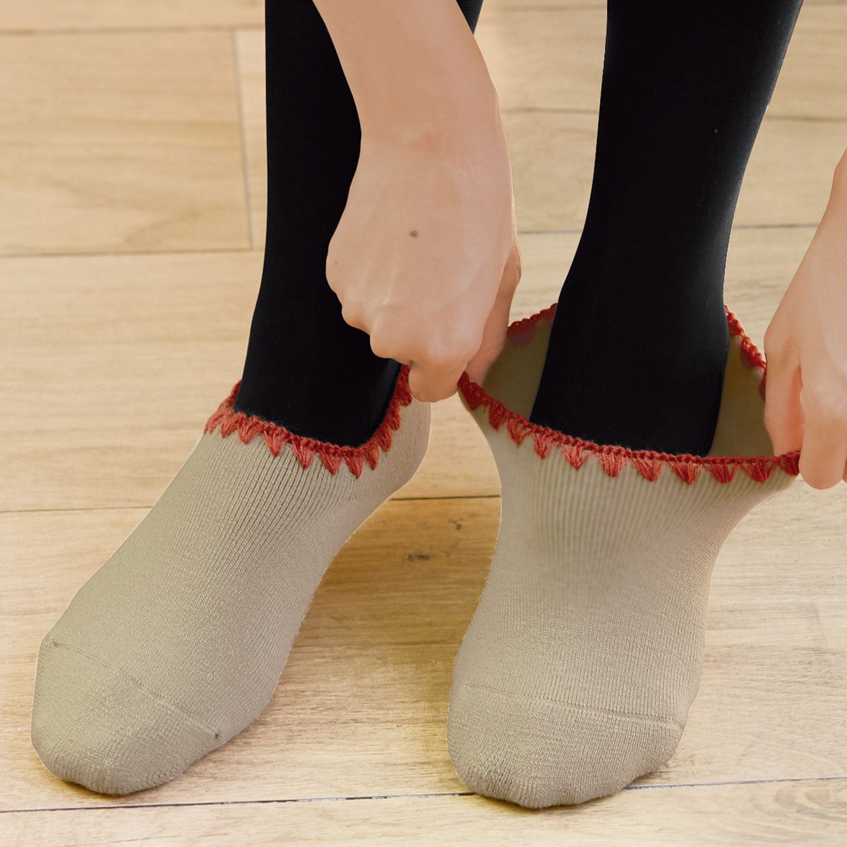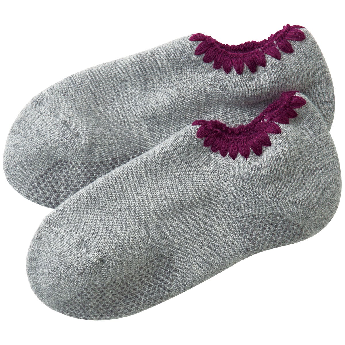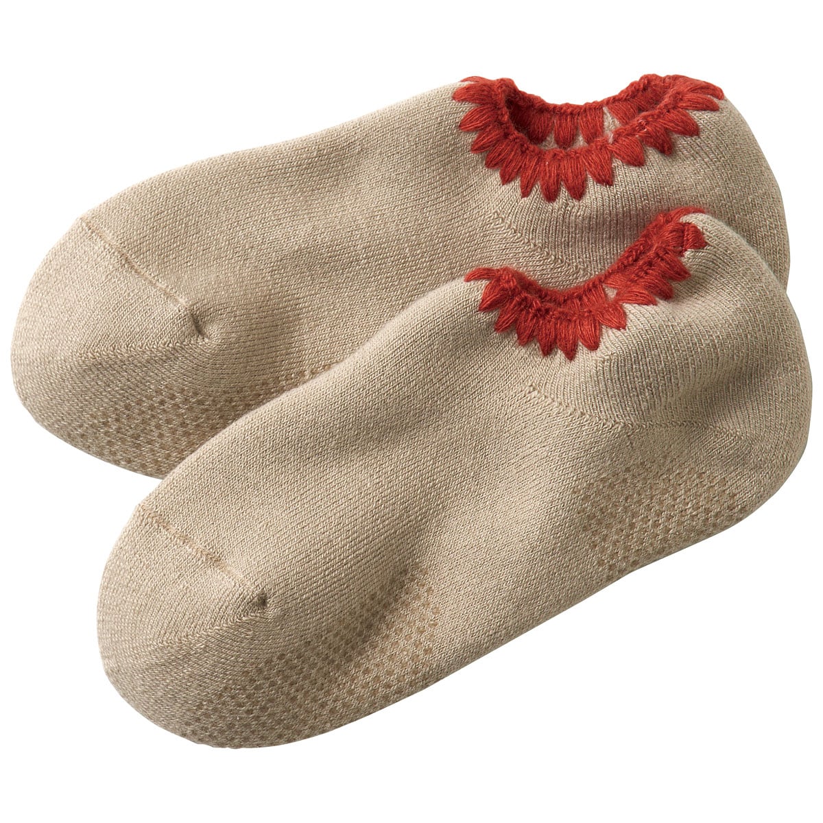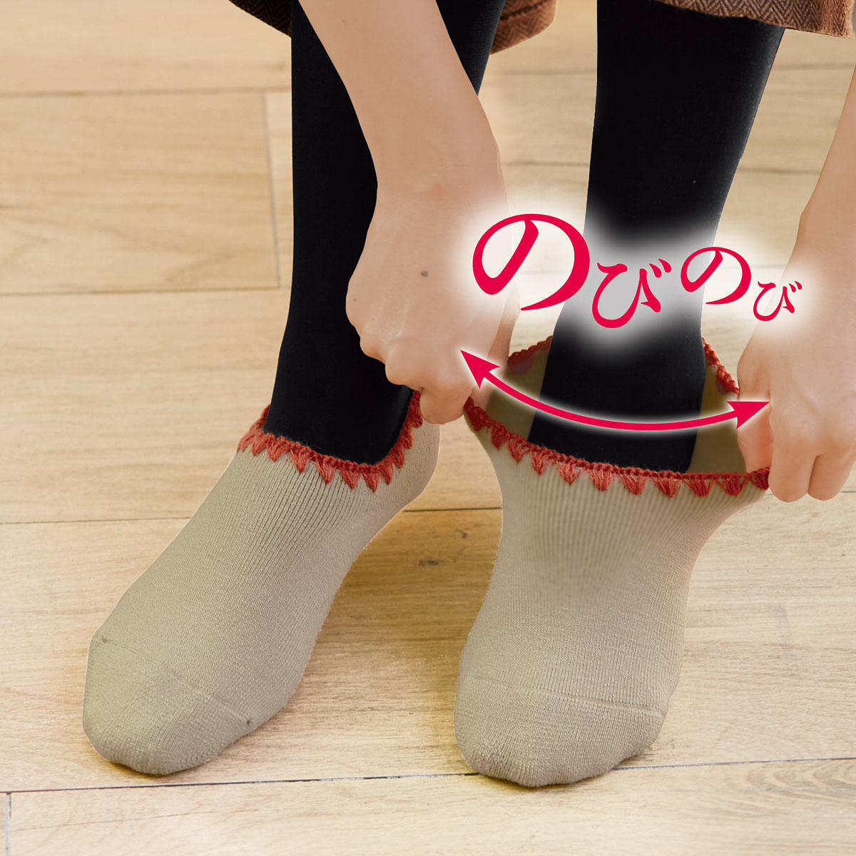 おうちで履くことを考えて、足底は滑り止め付き。肌側は全面裏パイルで肉厚感があり、はき心地やわらか。タイツと重ねても脱ぎ履きラクなように、履き口はのびのび仕様です。刺しゅうの配色ステッチもアクセントに。もちろん1枚履きもOKです。信頼の日本製。