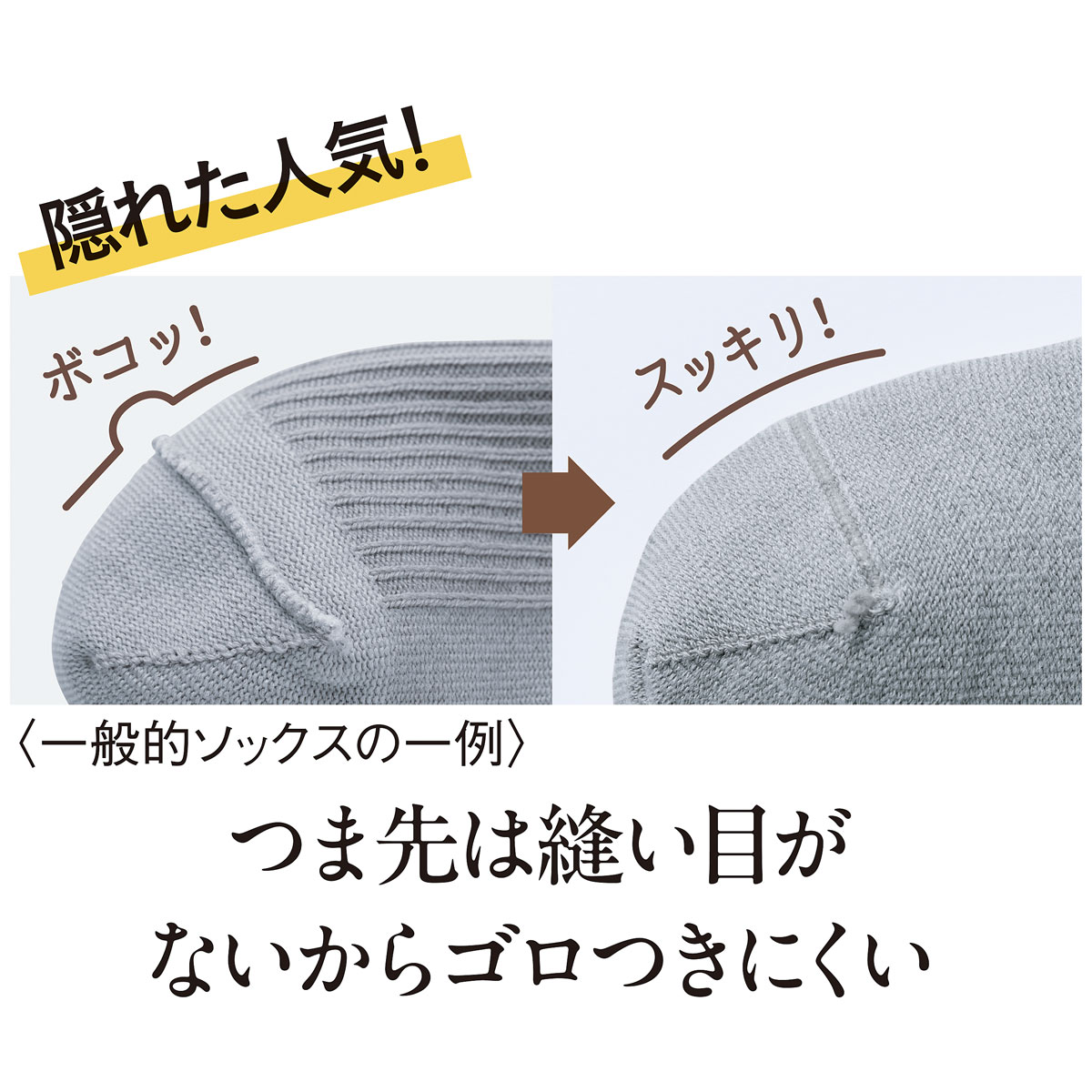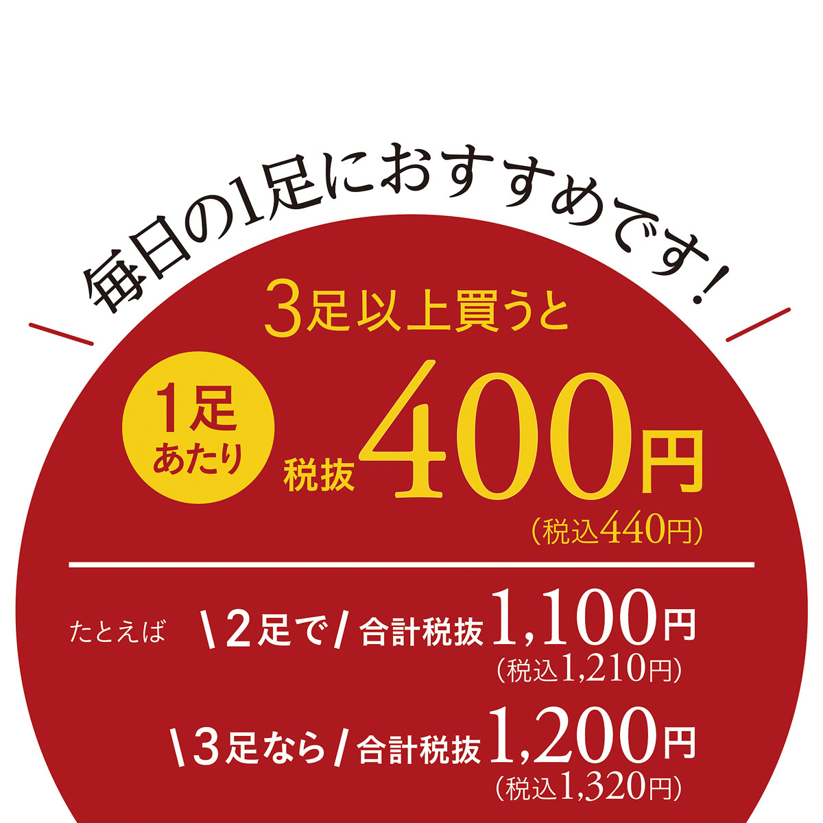 一年中使えるやや薄手のクルー丈ソックスです。多くのお客様のご要望にお応えして、履き口はゴムなしで締め付けない仕様に。また、つま先の縫い目をなくしてゴロ付きも解消しました。さらにかかとをしっかり包み込んでズレにくいのも特徴です。3足以上のまとめ買いがお得ですが、1足からでもお求めいただけます。
