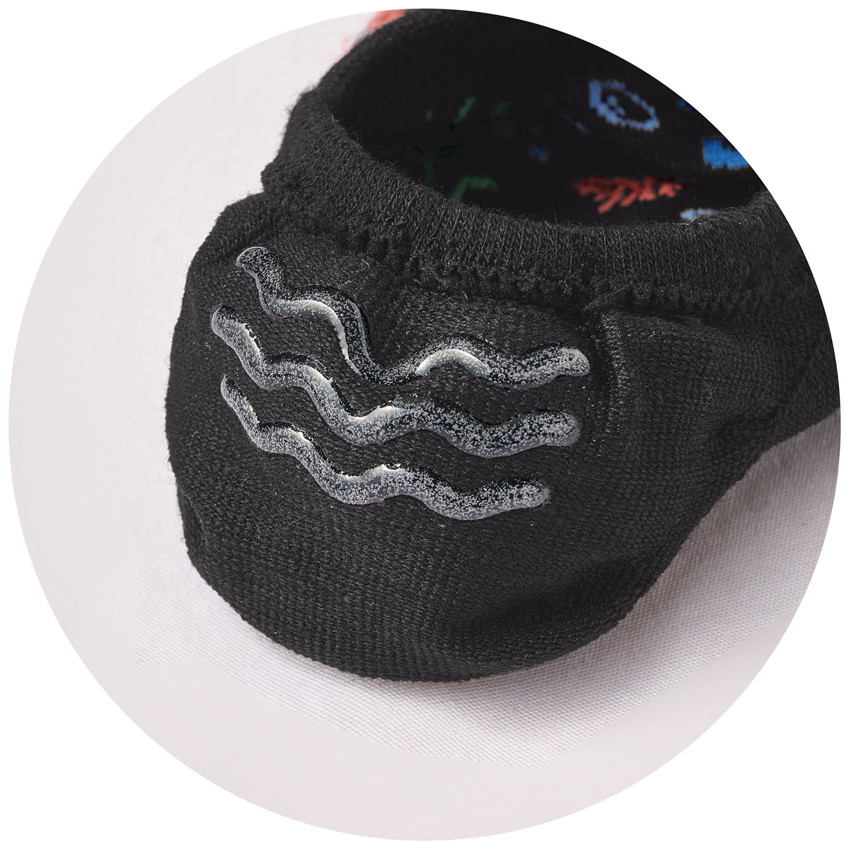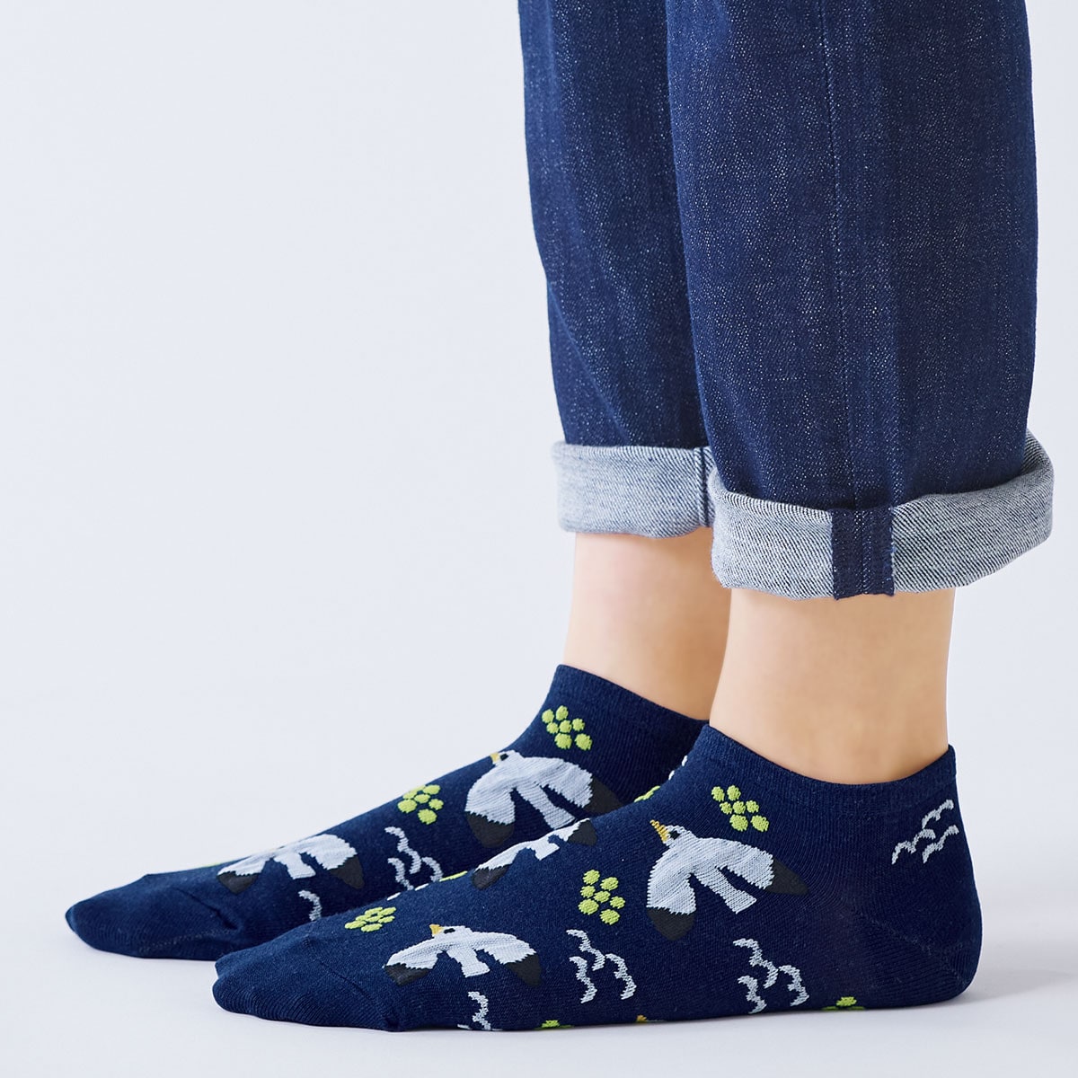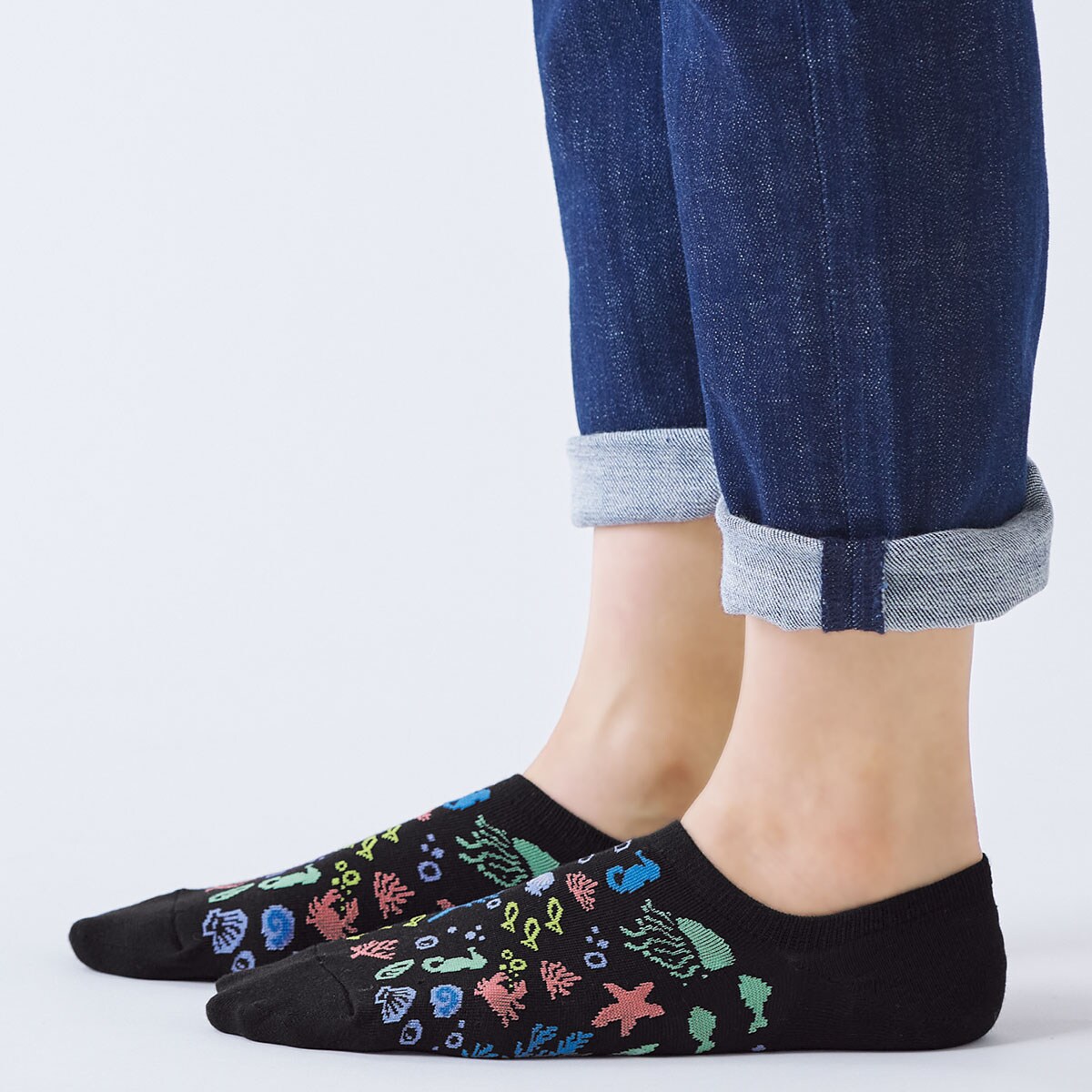 海にまつわる柄を配したスニーカー丈のソックスです。柄の一部に蛍光色をポイント使いして、元気さのある印象に仕上げました。スニーカーの履き口からすこし靴下がのぞくスニーカー丈と、ほとんど見えないスニーカーインの2タイプです。スニーカーインには、かかと裏にすべり止めを付けて脱げにくくしています。