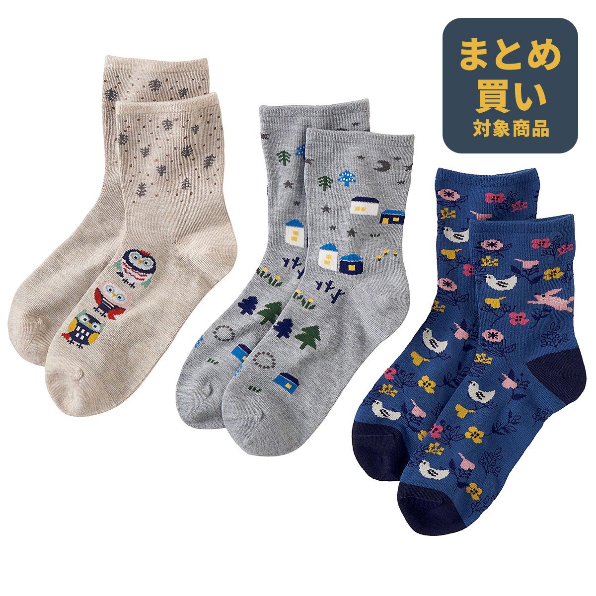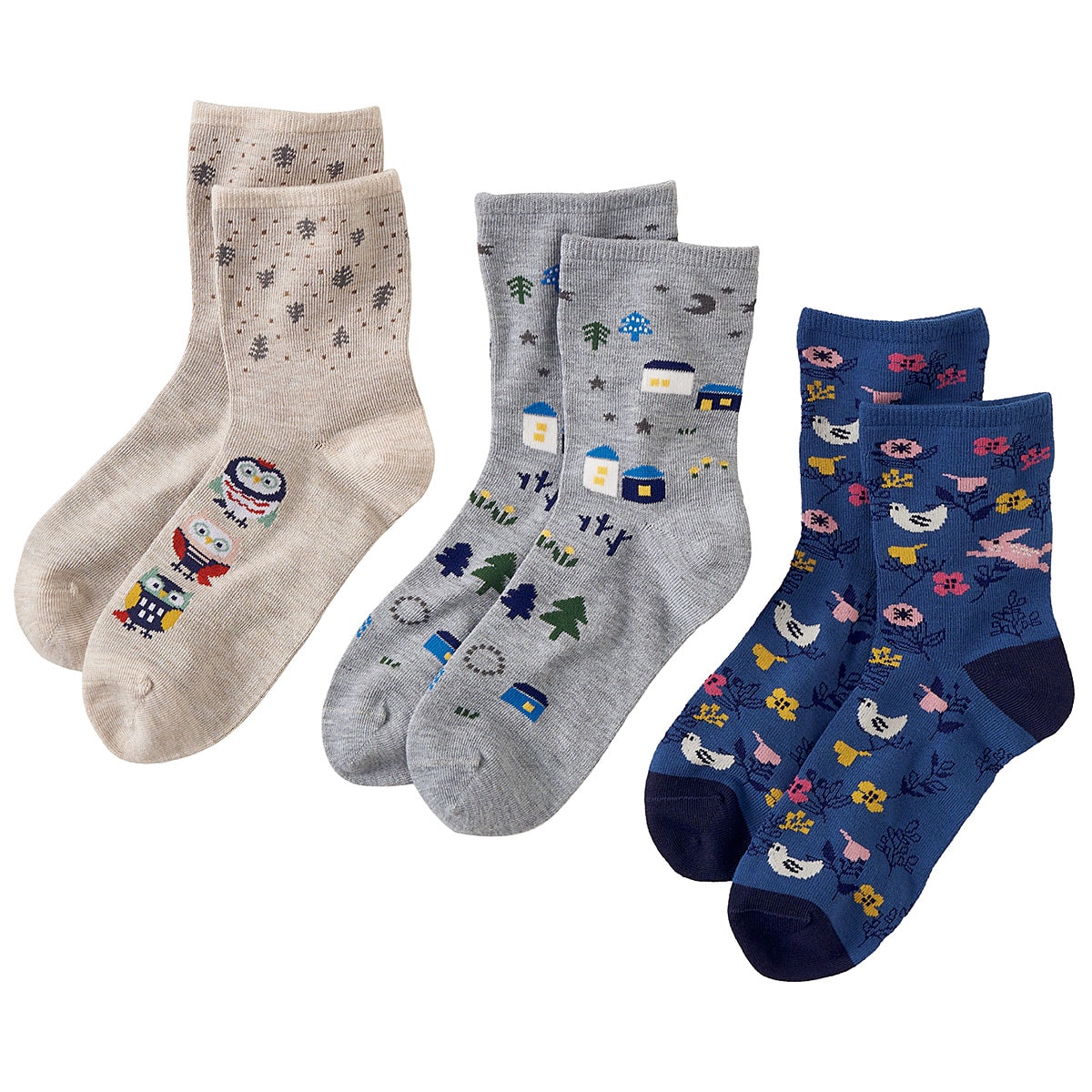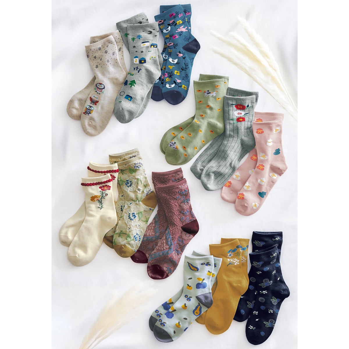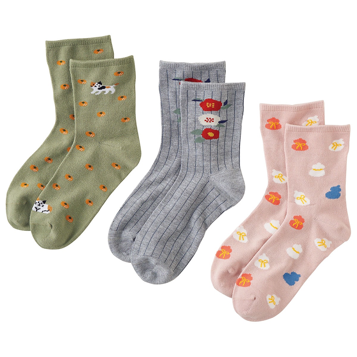 柄の可愛さはもちろん、靴下にありがちなお悩みを解消する快適設計にもこだわったクルー丈の3足組です。今年はノルディック調やボタニカル調の柄だけでなく、どこか懐かしい和柄も登場。