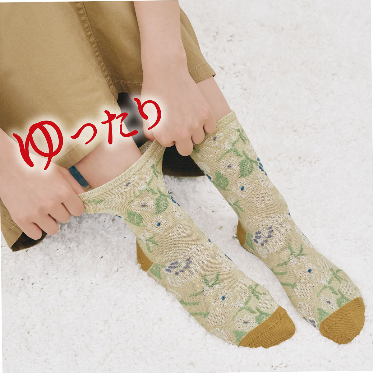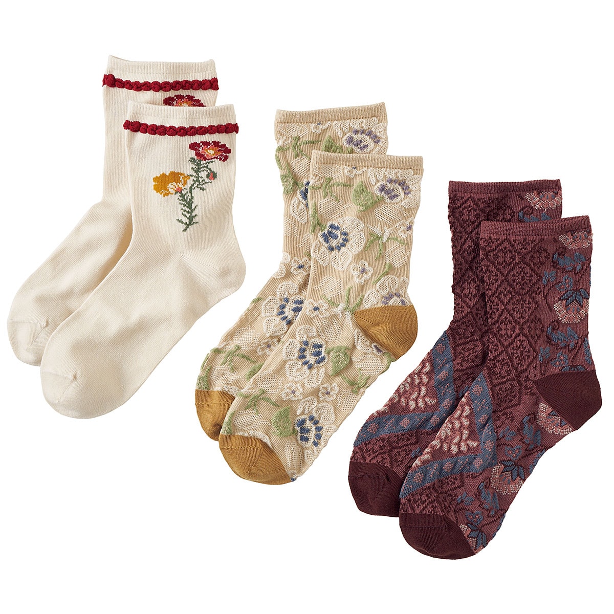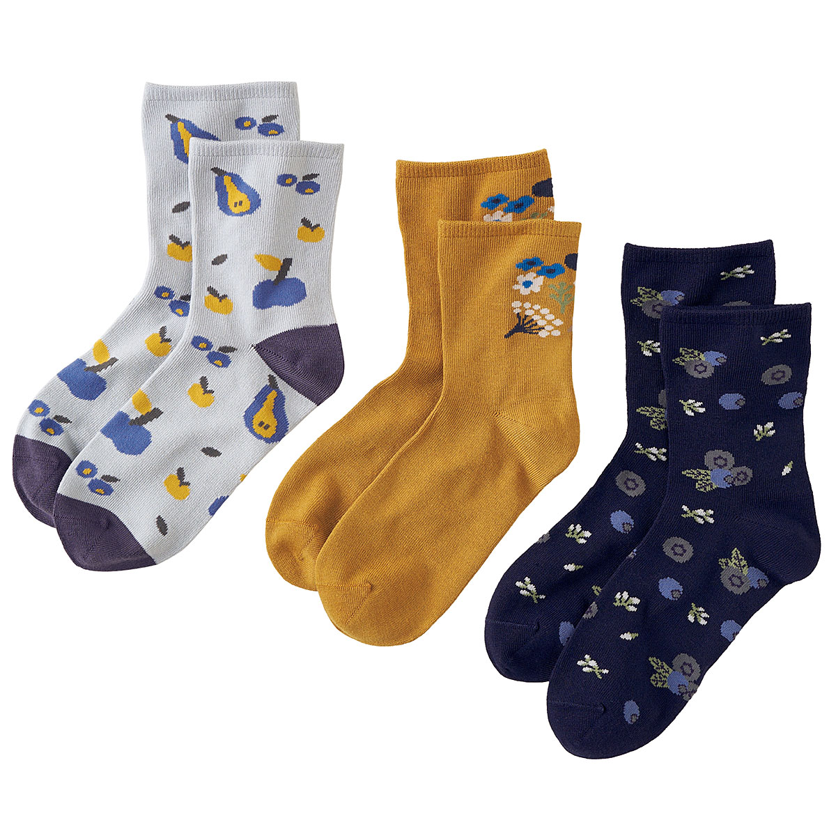 履き口締め付けない、つま先ゴロ付かないソックス・ 色柄違い3足組。上から)A(北欧テイスト)、B(和柄)、C(エレガントボタニカル)、D(果実)
