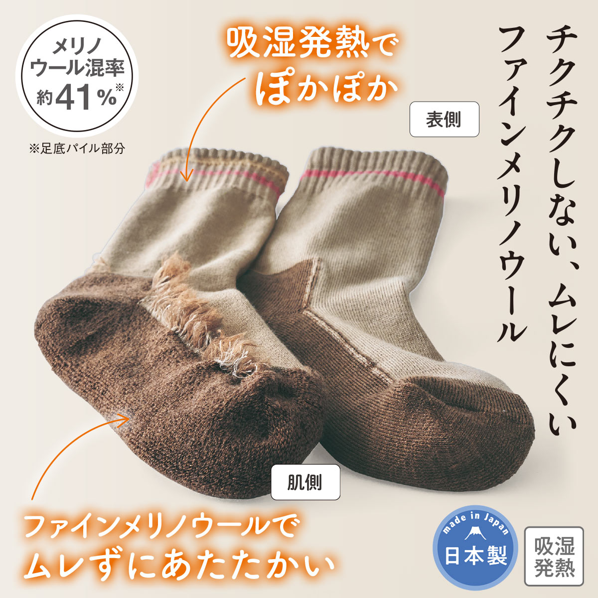 ■羊毛、アクリル、ナイロン、レーヨン●丈の目安20cm▼肌側に糸の端が出ておりますが、商品の特性であり、ご了承ください。●日本製【生地厚/ふつう】 【生地厚(パイル部)/厚手】 【フィット感/ふつう】 【メリノウール混率約41%】(底パイル部分)【発熱】 【吸湿】