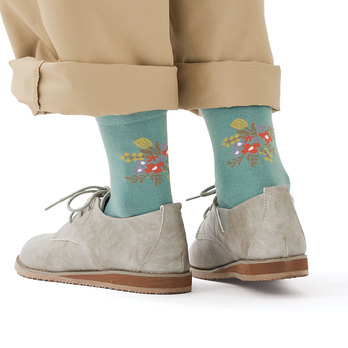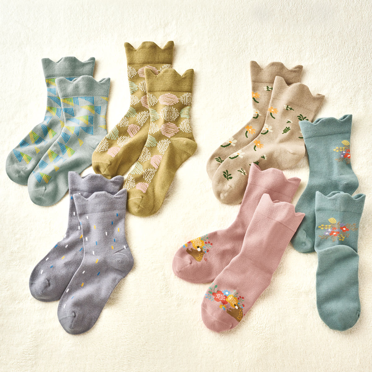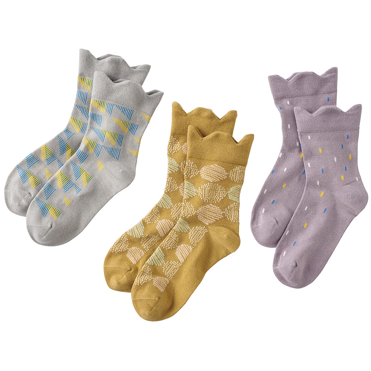 締め付けを軽減する、履き口スカラップデザイン。(左から)B(グレー系・カーキ系・パープル系)、A(ベージュ系・ブルー系・ピンク系)