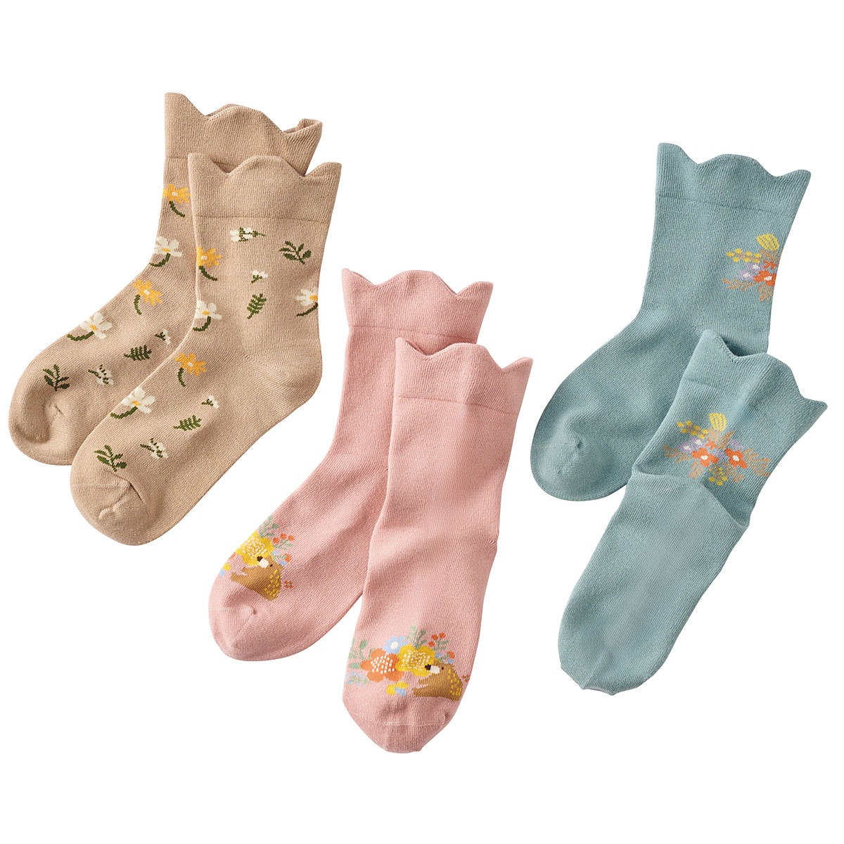 デイリー使いにちょうどいい、履き心地がゆったりした快適でかわいいソックス。履き口はスカラップデザインで締め付けすぎずゆったりラク♪つま先は縫い目がフラットでゴロつかない仕様。かかとはラージヒール設計でしっかり包み込んで気持ちよくフィットします。北欧テイストの小花柄や幾何学柄を揃えた色柄違い3足組。毎日の足元を楽しく演出します。