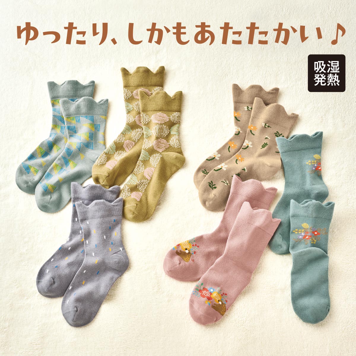 吸湿発熱素材で湿気をあたたかさに変えてぽかぽか。履き口ゆったり靴下・色柄違い3足組