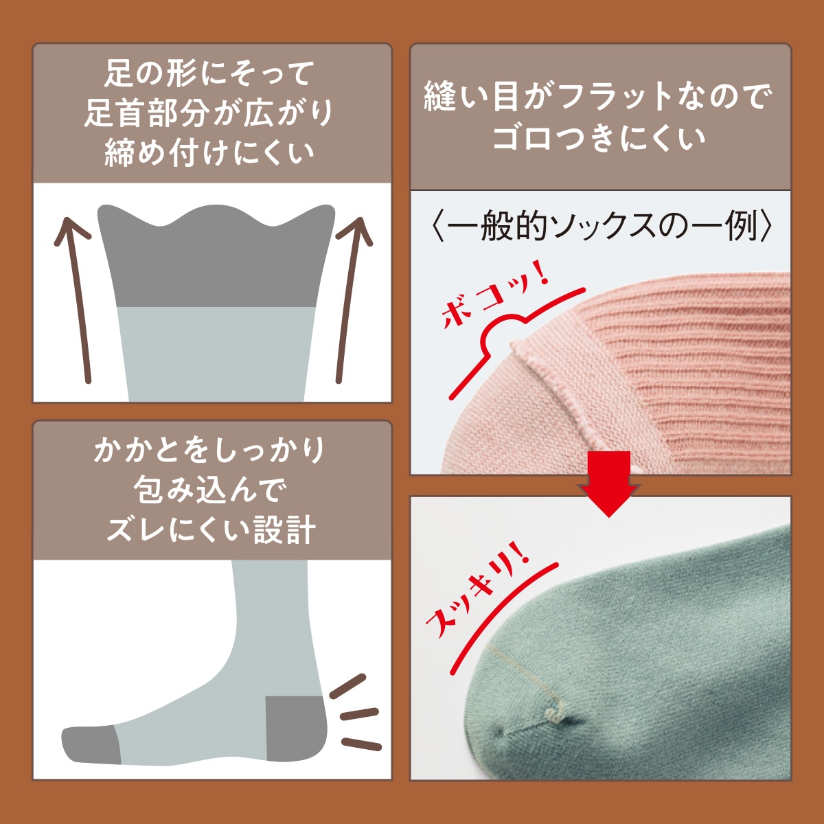 足の形にそって足首部分が広がり締め付けにくい
