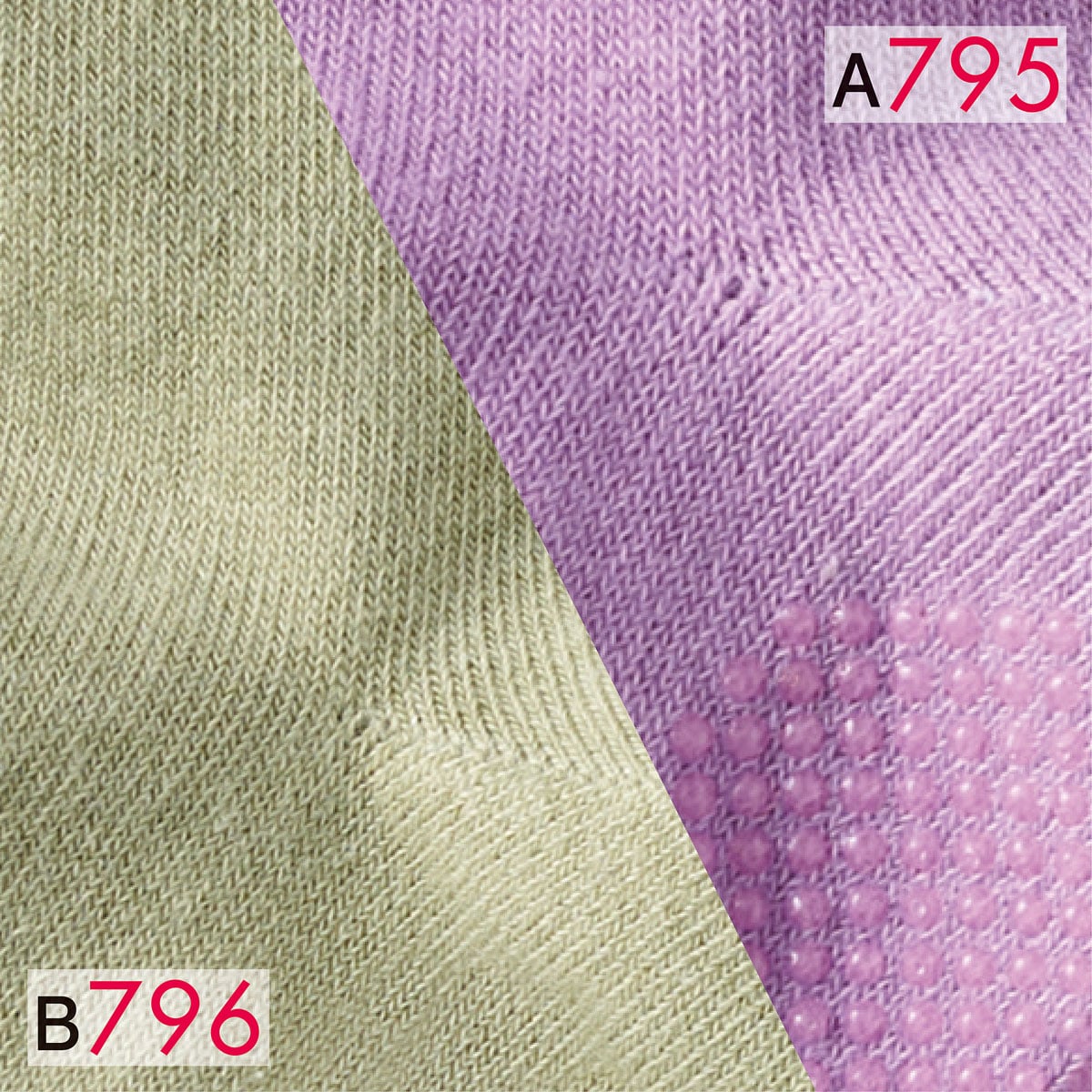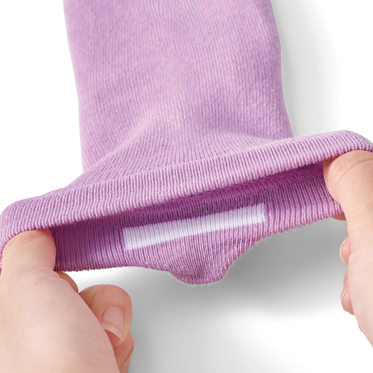 靴下を履く時のわずらわしさを少しでも軽減するために、後ろ側につまみを付けて引き上げやすくしました。心地よい綿混素材で履き口はゆったり締め付けにくく、さらにつま先の縫い目を無くしてゴロ付きにくい仕様です。履き口の後ろ側肌面にはお名前スペースを設けて、持ち主もわかりやすく。足底はすべり止め加工なし(A)とすべり止め加工あり(B)の2セットをご用意しました。必要に応じて使い分けていただけます。