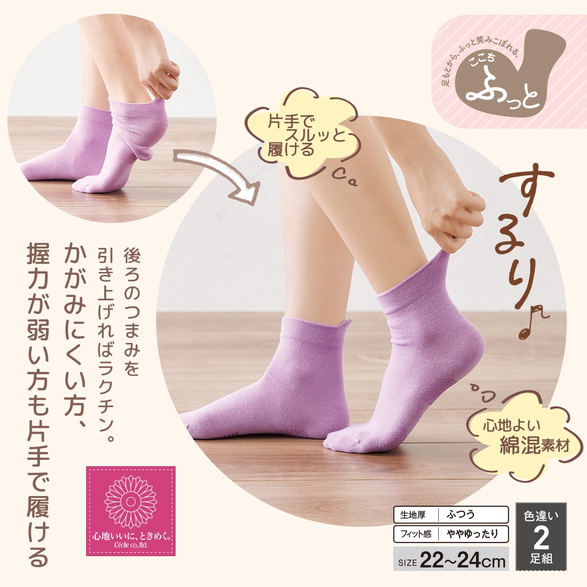 ここち履きつまみソックス・色違い2足組(片手で履ける)(滑り止め付き)(綿混)
