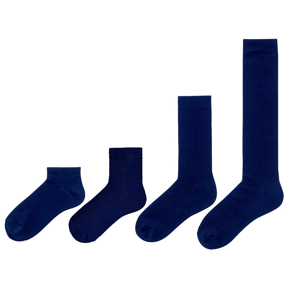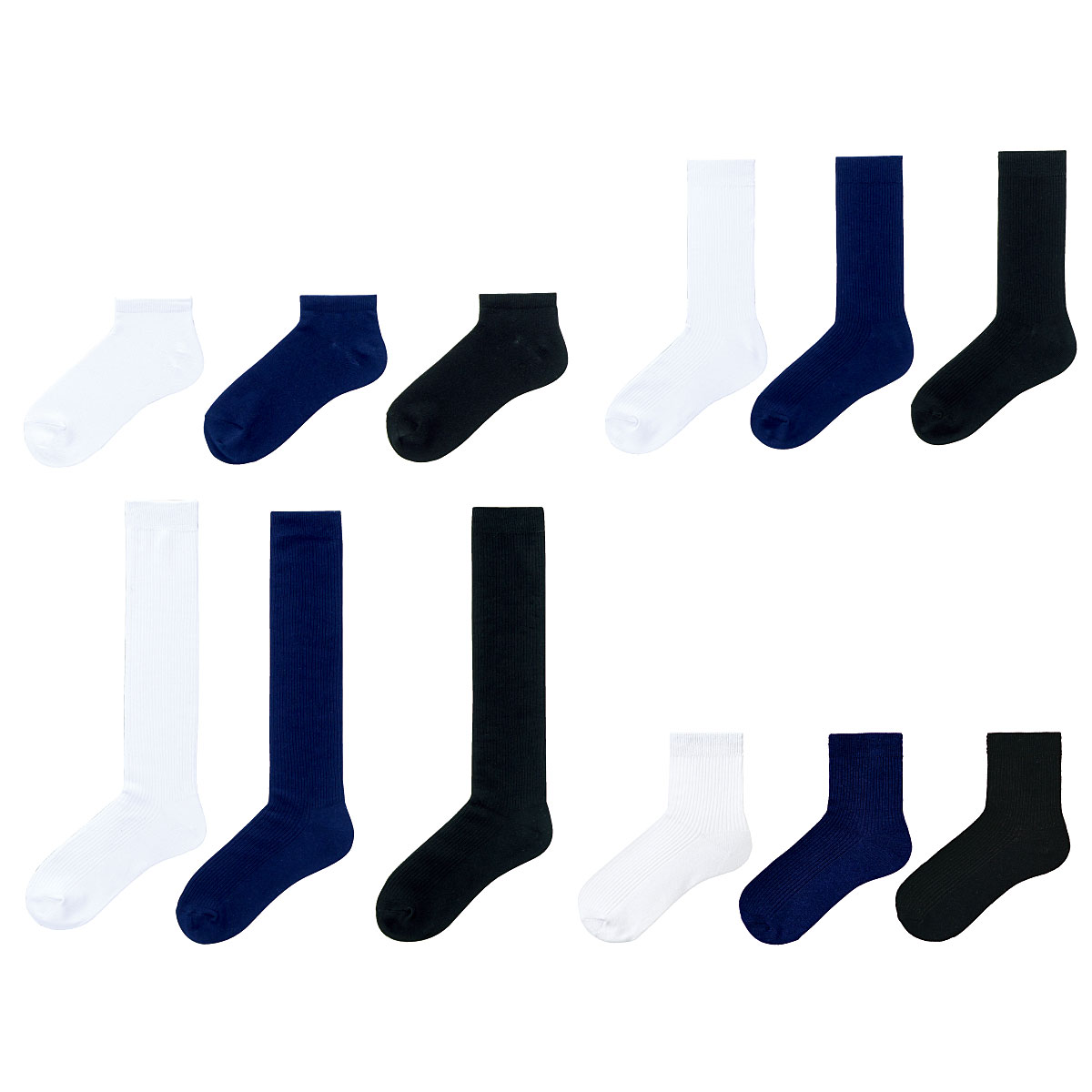 4丈から選べます。左からスニーカー、ショート、クルー、ハイソックス丈