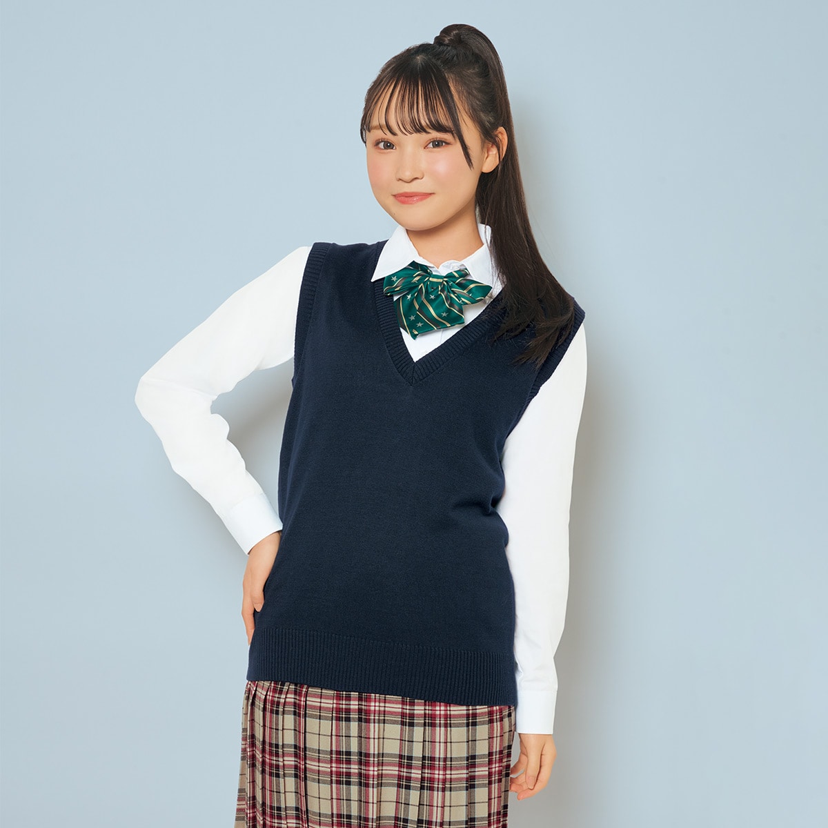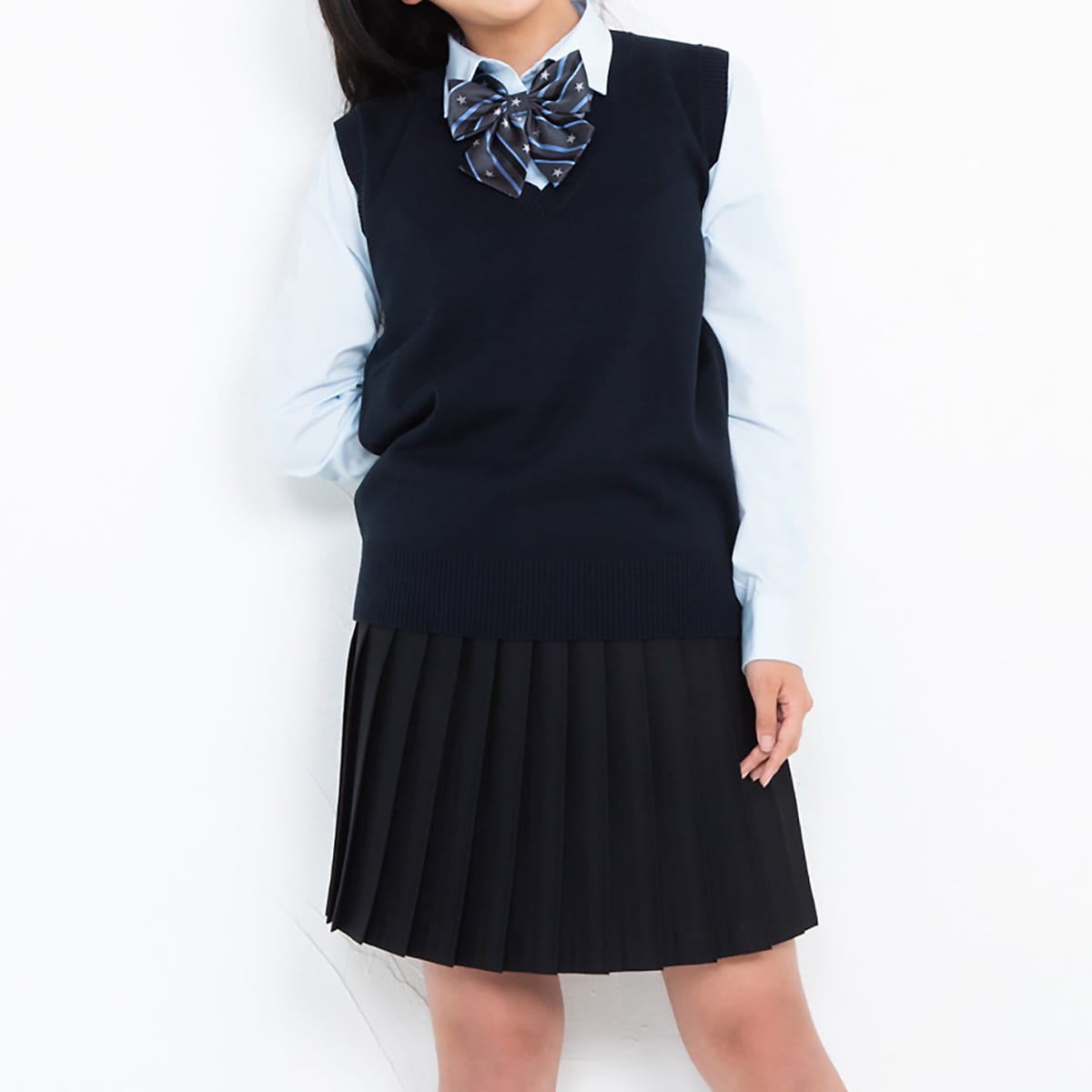 暑がりさんにおすすめ!薄手素材でムレにくく、抗菌防臭機能付きで汗のニオイも気になりにくい♪夏に嬉しいVネックニットベストだよ。小さいサイズから、大きいサイズまで揃った豊富なサイズ展開も魅力(S~LL)。学生制服にも、なんちゃって制服にもおすすめです。