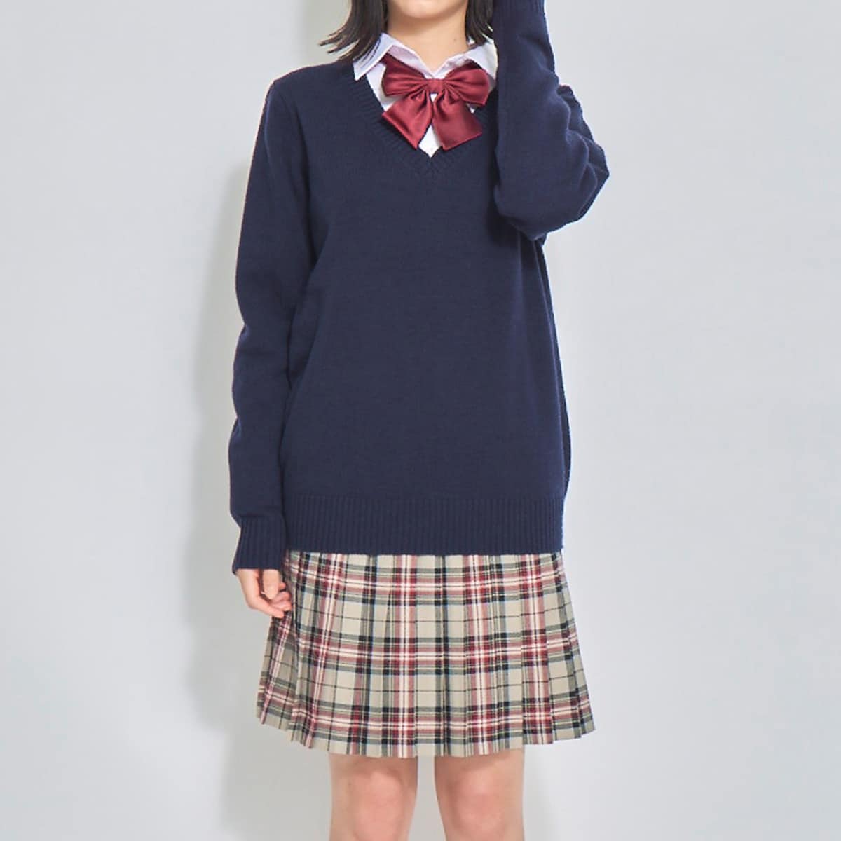 プチプラなので色違いで揃えたいほど。シンプルなのでとっても着やすい!ネクタイもリボンも映えるちょうどよい開きのVネックで好印象に。冬の制服ニットにぴったりな7ゲージです。