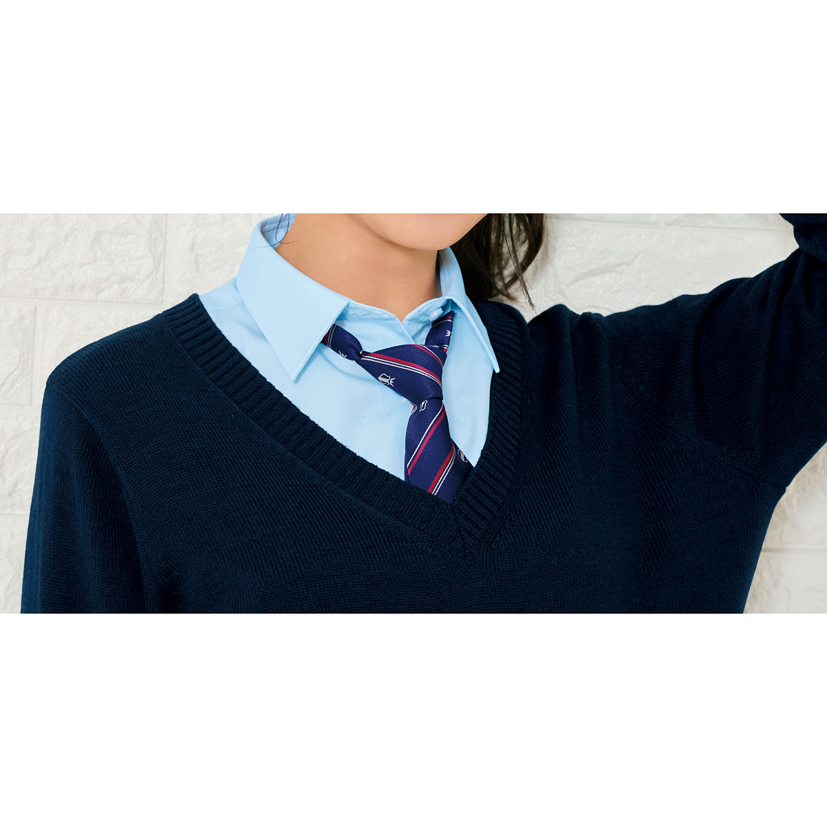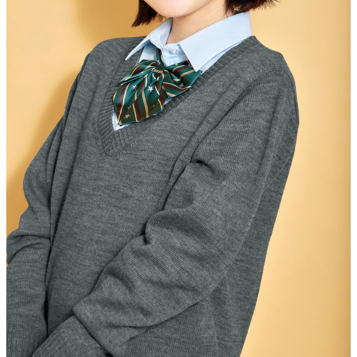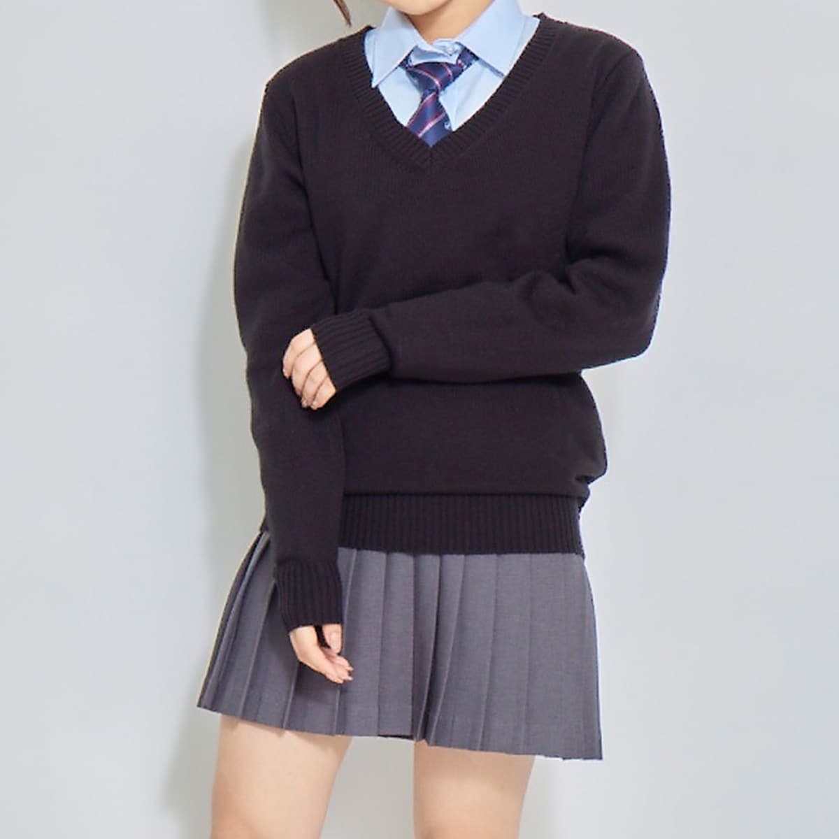 プチプラなので色違いで揃えたいほど。シンプルなのでとっても着やすい!ネクタイもリボンも映えるちょうどよい開きのVネックで好印象に。冬の制服ニットにぴったりな7ゲージです。