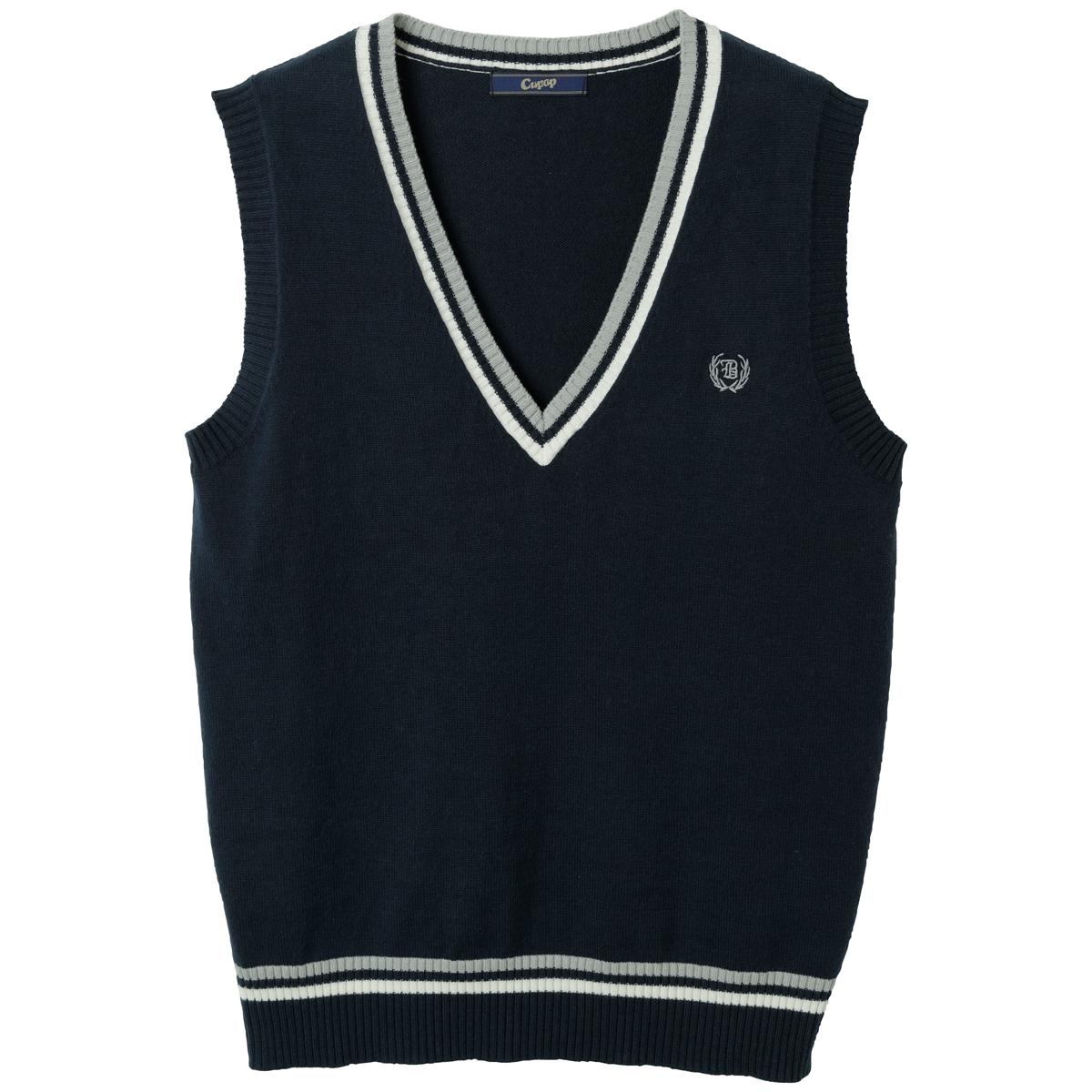 【Cupopオリジナルデザイン】綿混素材で肌触り良く年中着られる♪ちょっと差がつくデザインに注目!刺しゅうロゴ&配色ラインのVネックニットベスト。洗濯機で洗えるのでケアもらくちん。学生制服にも、なんちゃって制服にもおすすめです。【キューポップスクール】