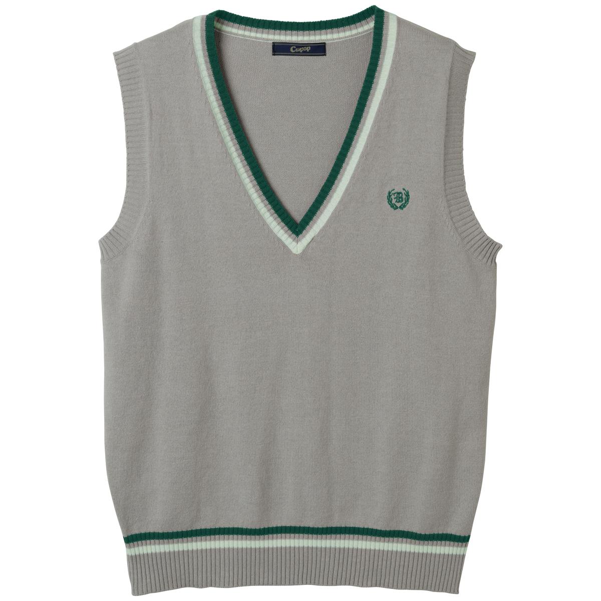 【Cupopオリジナルデザイン】綿混素材で肌触り良く年中着られる♪ちょっと差がつくデザインに注目!刺しゅうロゴ&配色ラインのVネックニットベスト。洗濯機で洗えるのでケアもらくちん。学生制服にも、なんちゃって制服にもおすすめです。【キューポップスクール】