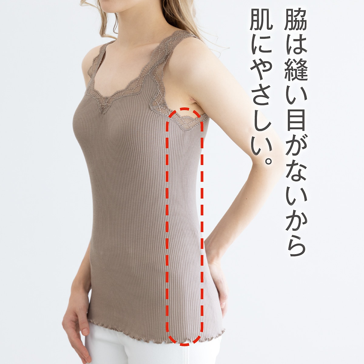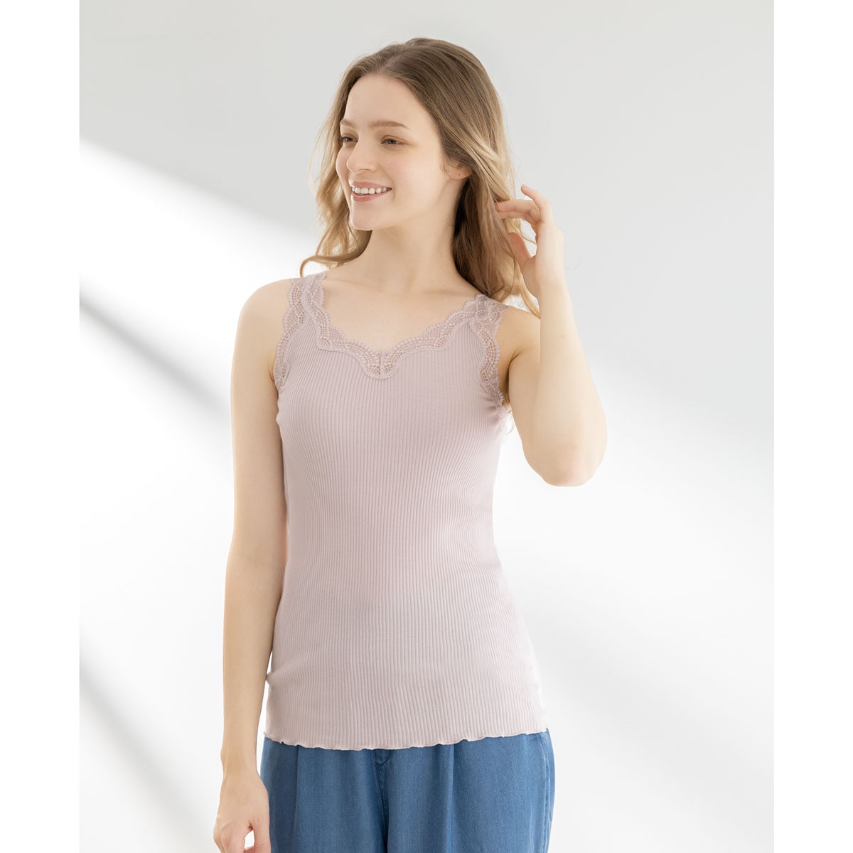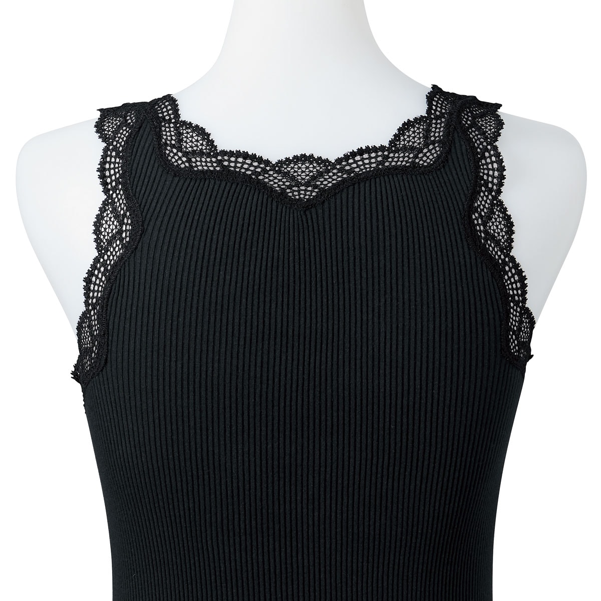 しなやかなリブ素材だから窮屈感がなく、贅沢なレース使いのタンクトップ風のデザインで、アウターからレースをのぞかせる着こなしもおしゃれに決まります。