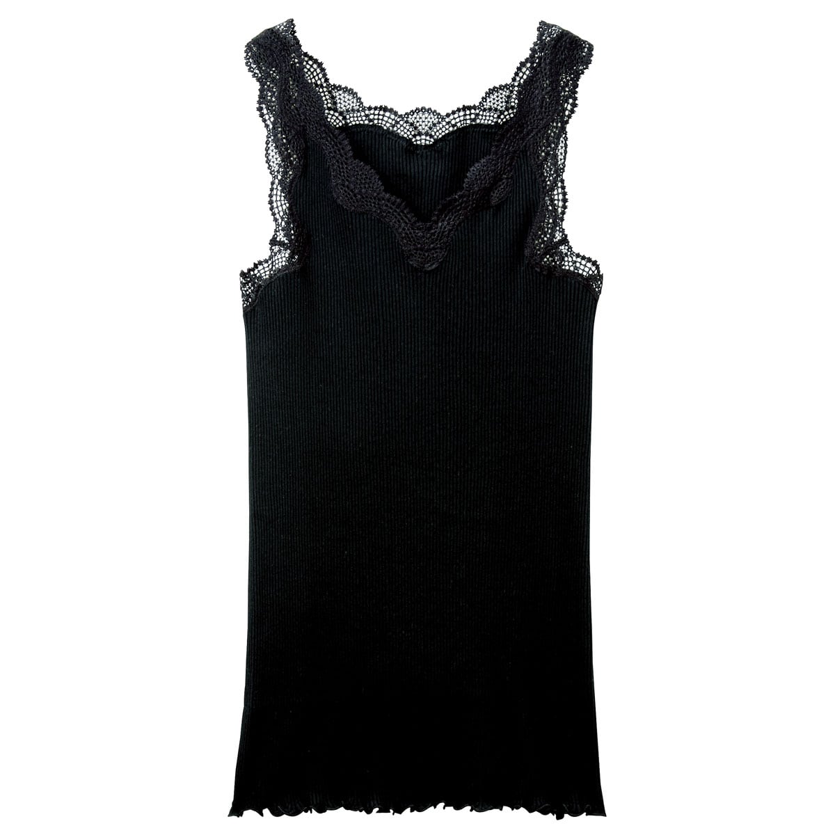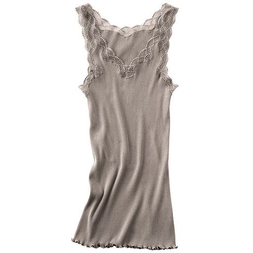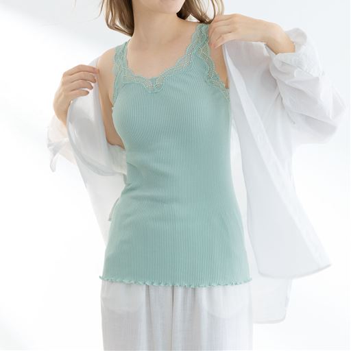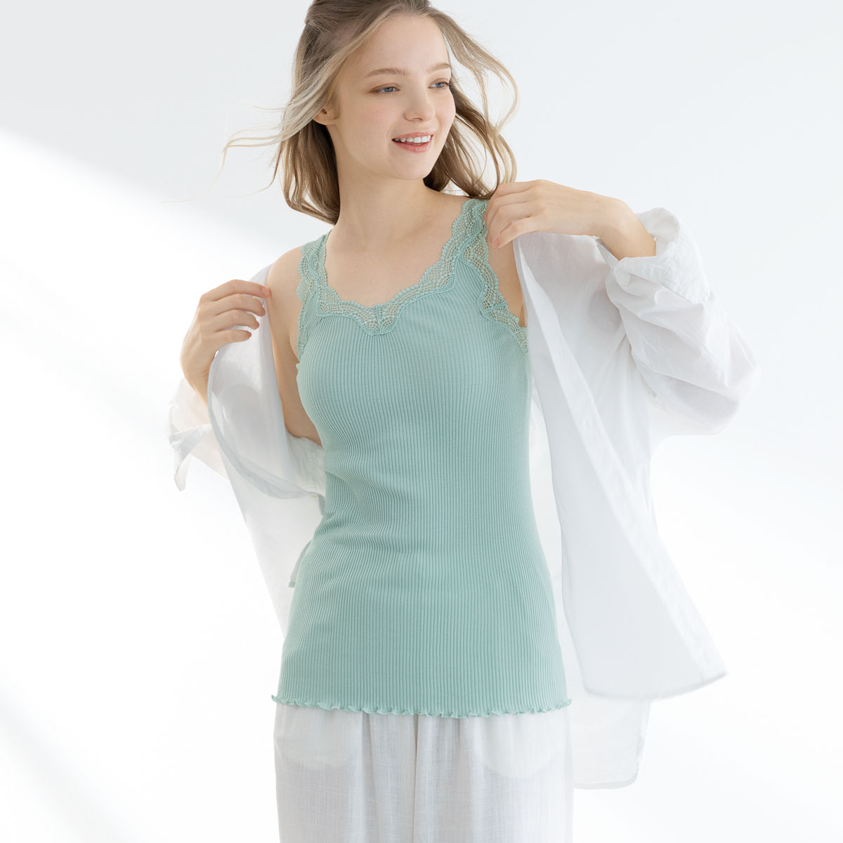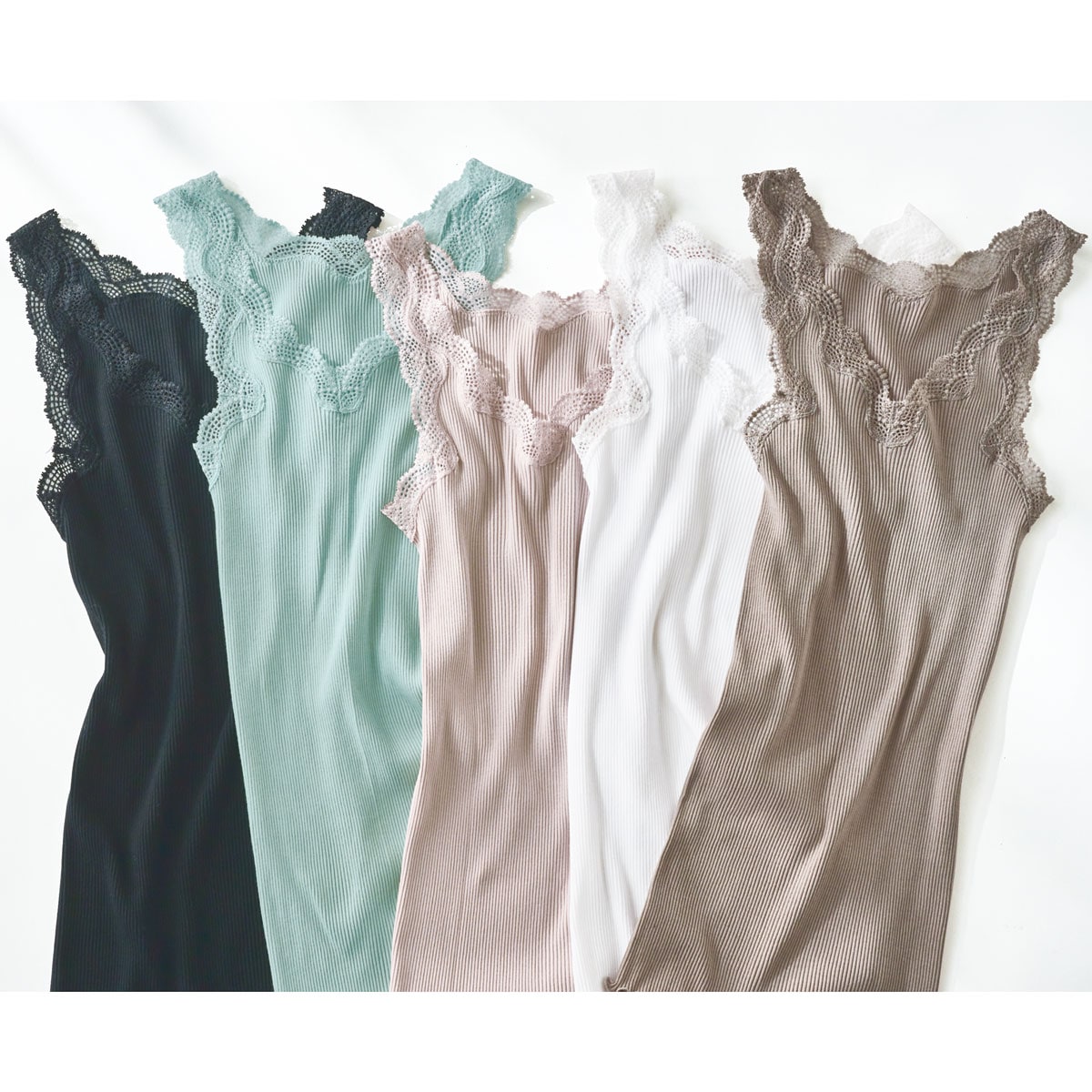 しなやかなリブ素材だから窮屈感がなく、贅沢なレース使いのタンクトップ風のデザインで、アウターからレースをのぞかせる着こなしもおしゃれに決まります。