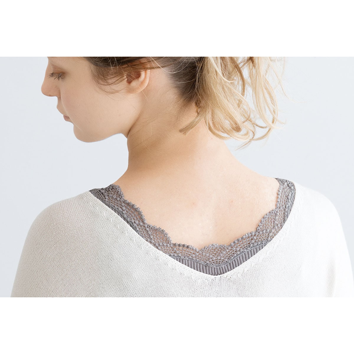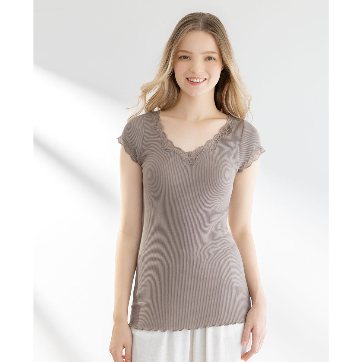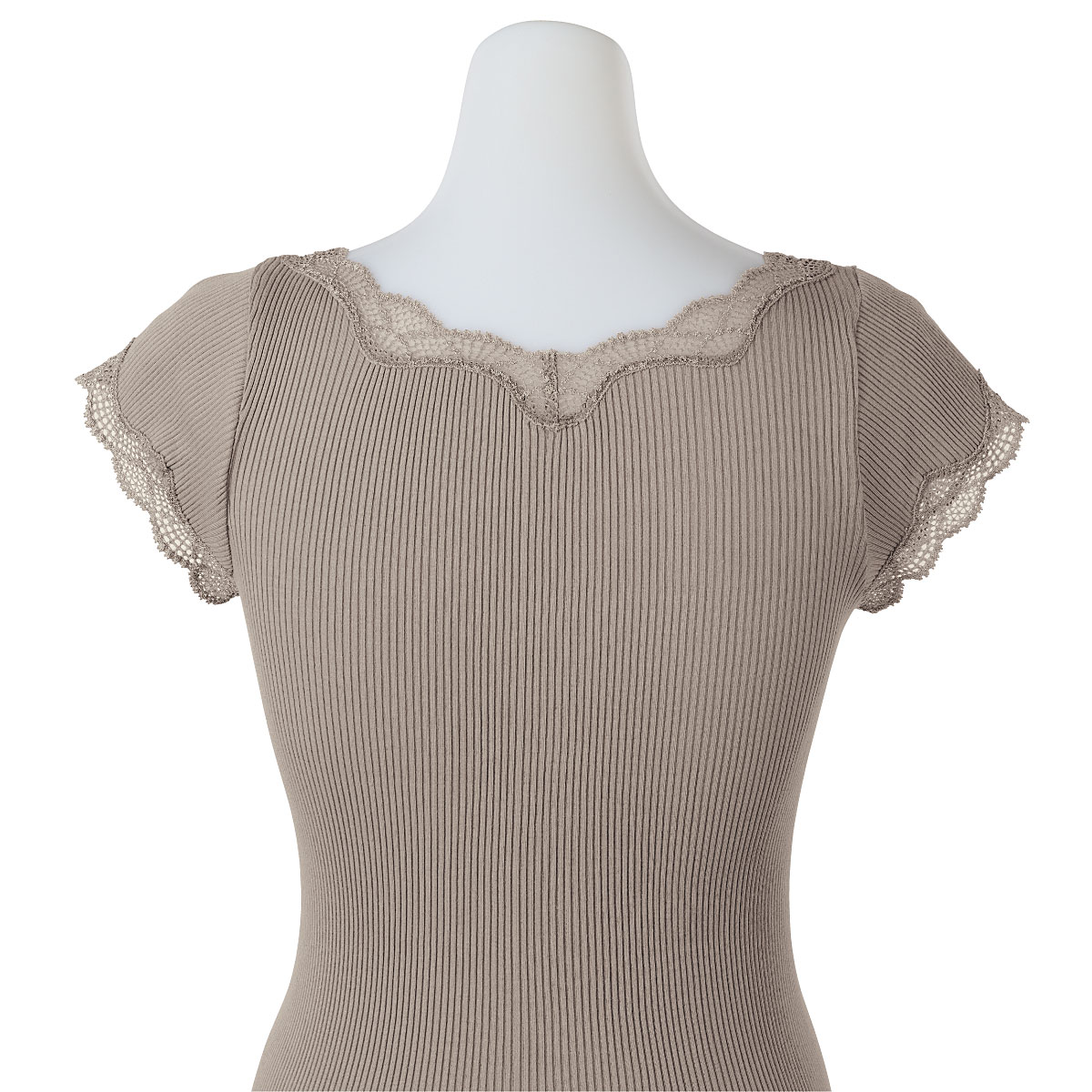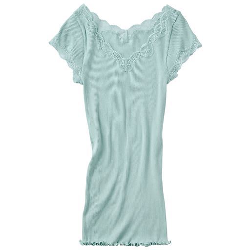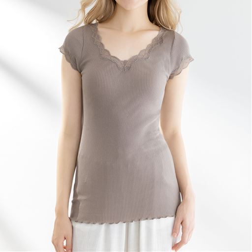 リブなので肌に付かず離れずで心地良い。生地も柔らかで伸びも良い。フレンチ袖はワキ汗も防止してくれるのでお気に入りです。首周りのレースも可憐でチラ見えがカワイイ。とにかく何枚も色違いで欲しい!リピリピです。(40代お客様)