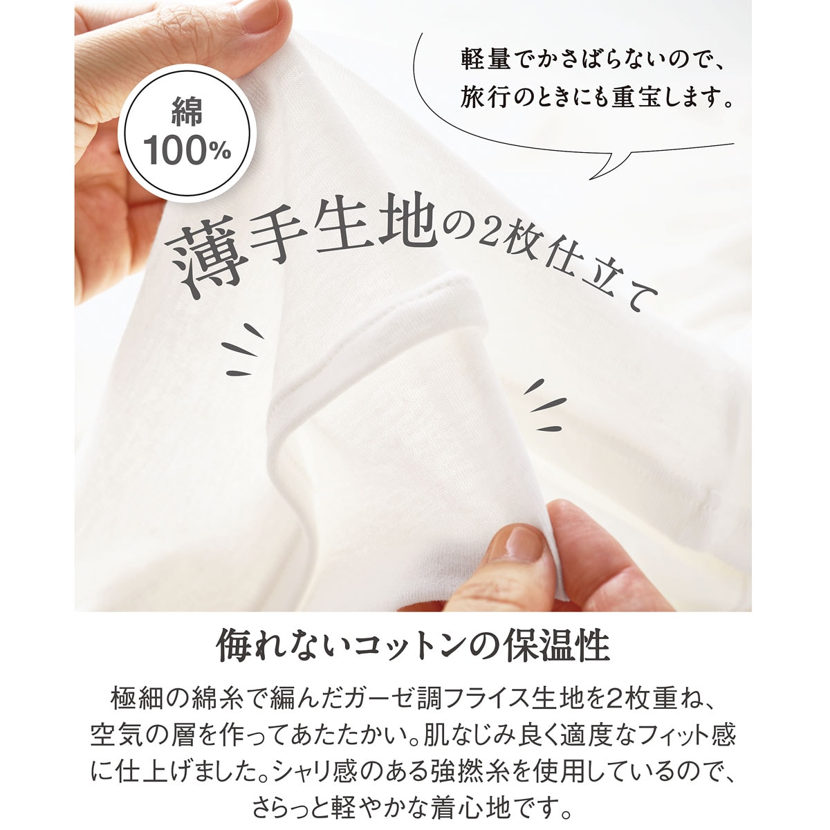 ふんわり、さらっ、肌ばなれのい綿100%シフォン極細の綿糸で編んだガーゼ調フライス生地を2枚重ね、肌なじみ良く適度なフィット感に仕上げました。シャリ感のある強撚糸を使用しているので、さらっと軽やかな着心地です。