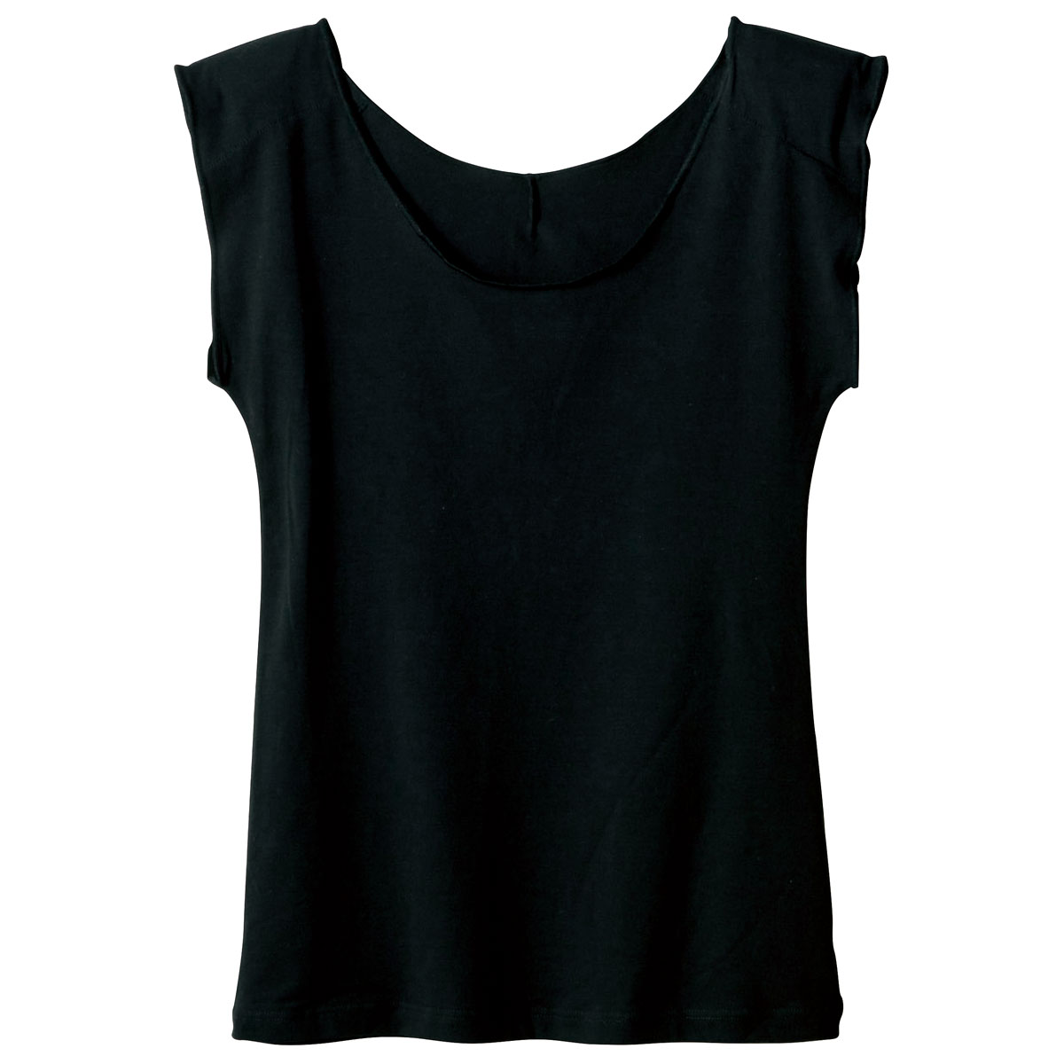取外し可能な肩パッドが付いたノースリーブです。肩のラインに沿う設計だから、どんな服も自然なシルエットで着こなせます。なんだか服を着こなせないな・・・そんなお悩みを持つ、肩に丸みのあるふっくらさんや、なで肩さんでも、肩パッドの効果でシャキッとすっきりした印象に。綿混のストレッチ素材を使い、衿や袖口はアウターにひびきにくいフラットな仕様で仕上げています。