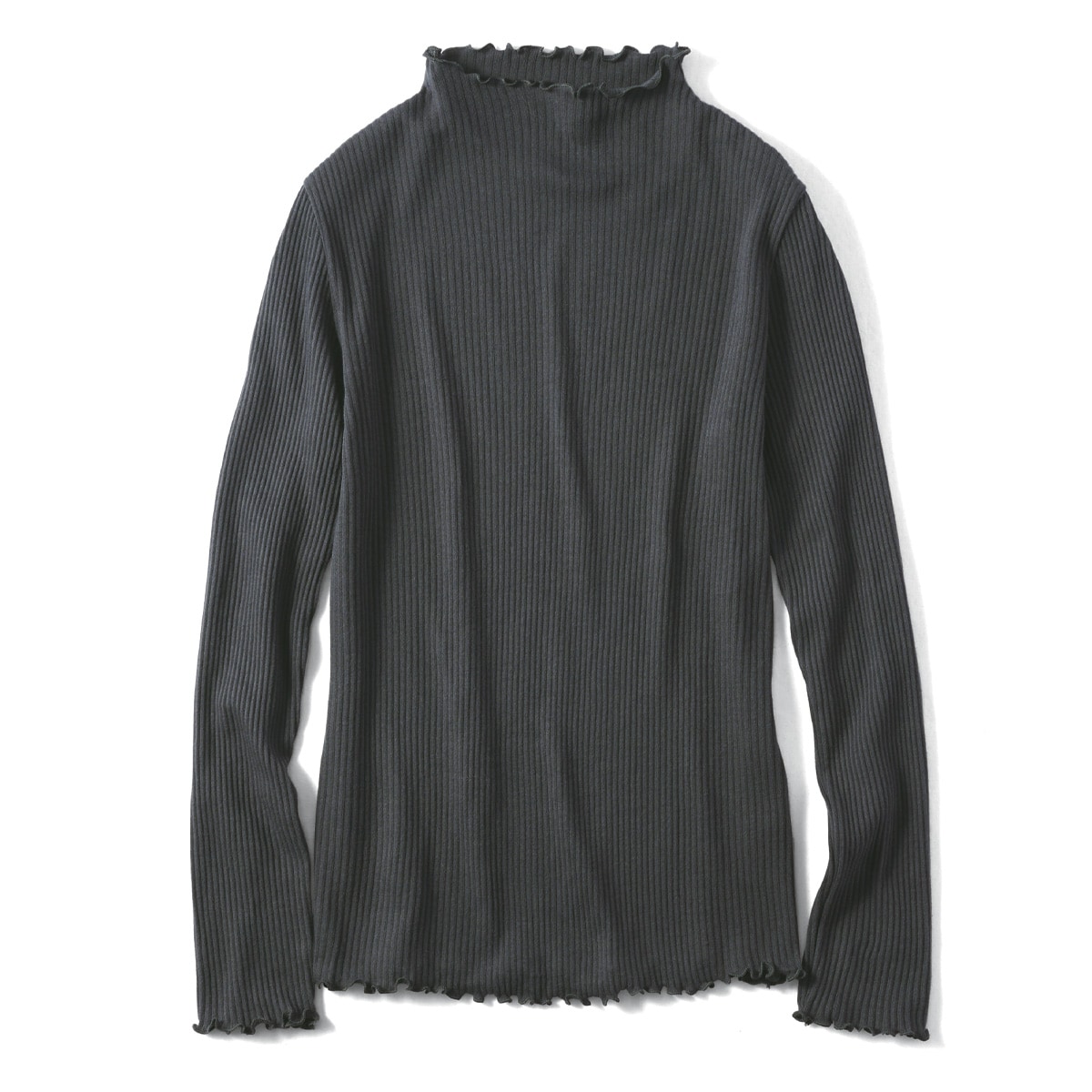 1枚で着るのはもちろん、重ね着にもぴったりのボトルネック10分袖。ワンピースなどとのフェミニンな重ね着コーデに使えば、ぬくもりをプラスしながら、袖口と首元のメロウ仕上げが上品で愛らしいアクセントに。メリノウール糸のまわりを綿糸でカバーした綿ウール素材で、あたたかい着心地と天然素材のやさしさを両立。体のラインを拾わない付かず離れずのシルエットで使いやすいリブインナーです。大きいサイズ(3L)もあります。
