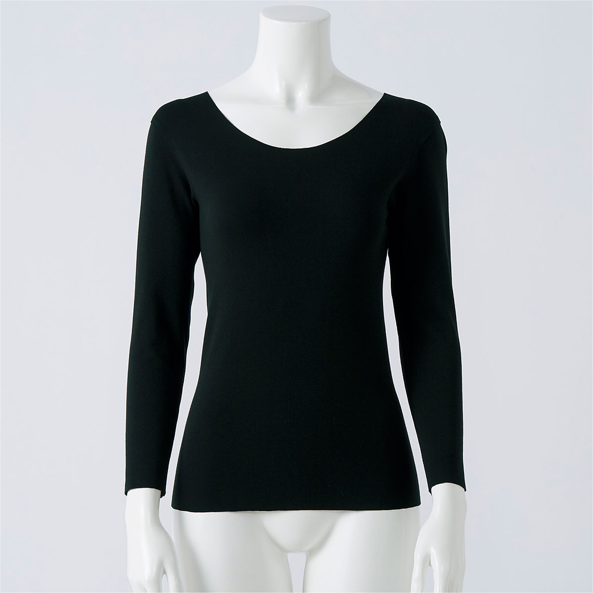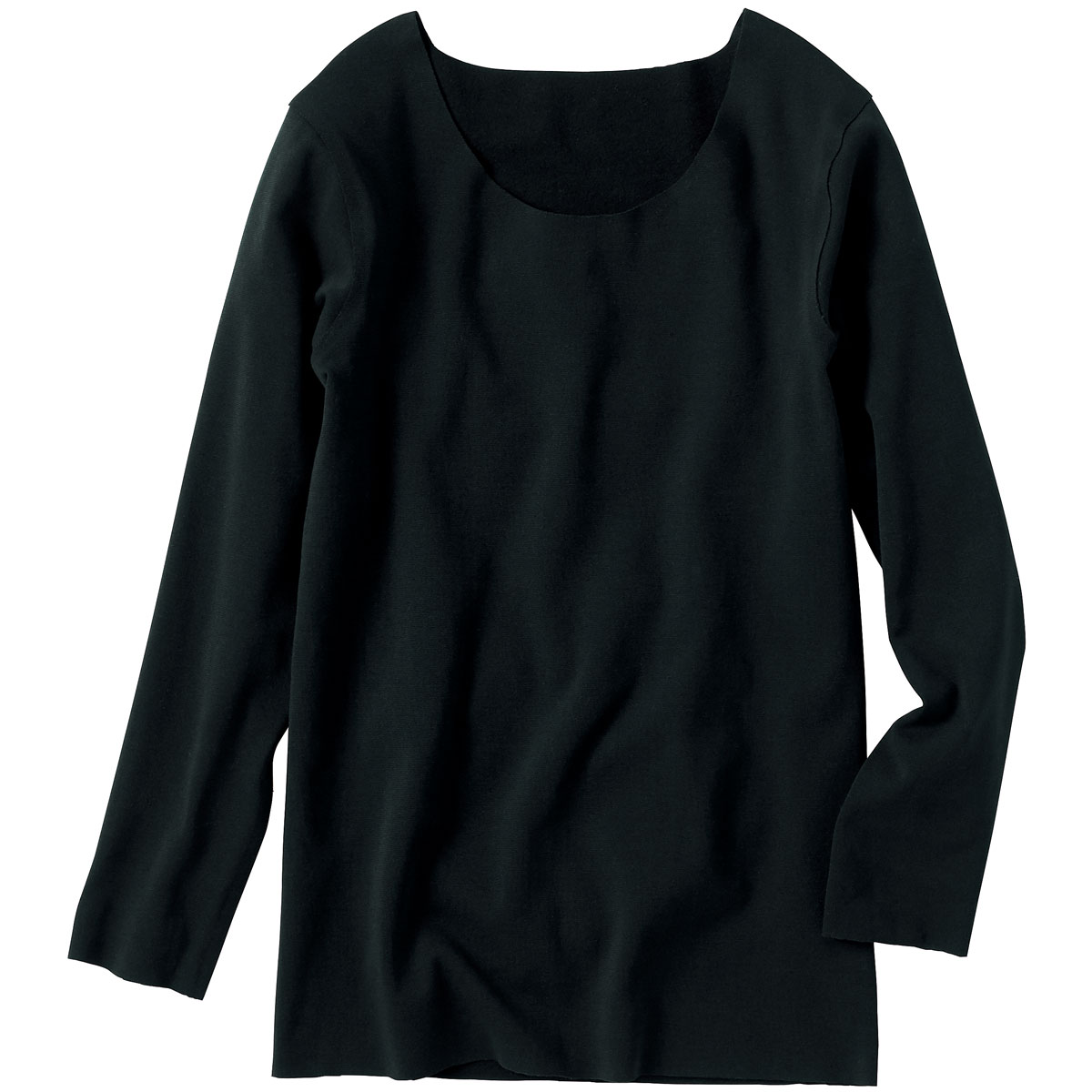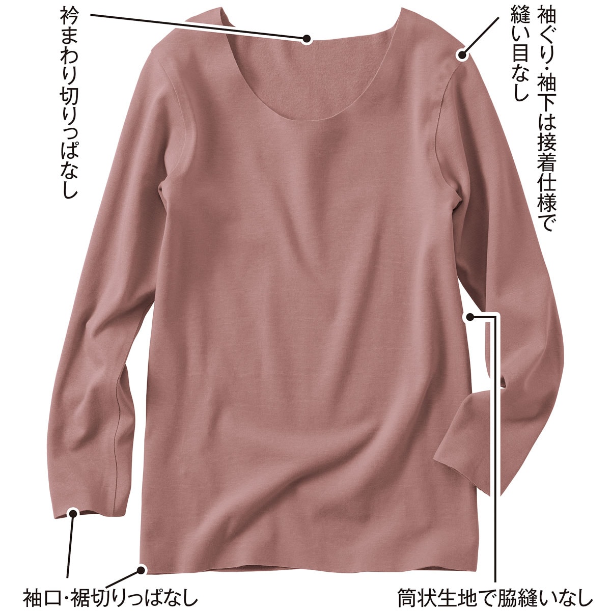 アウターにひびきにくい グンゼのカットオフ®による、切りっぱなしでもほつれにくい素材を使用。アウターへのひびきもおさえる。衿まわりも切りっぱなしです。